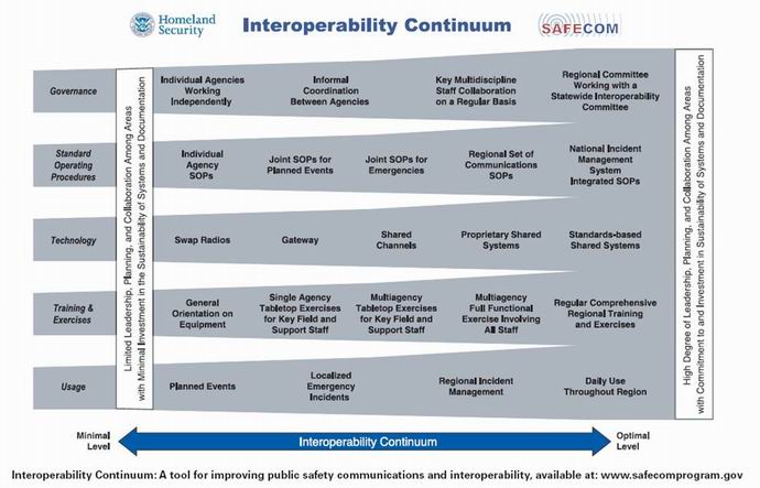 互操作通信可持續(xù)發(fā)展計劃演進圖 隨著跨區(qū)域應(yīng)急通信保障任務(wù)的日益繁重,相關(guān)應(yīng)急通信部門應(yīng)高度重視橫向互操作通信的問題,除了研究技術(shù)支撐外,還要從體制、機制、模式、操作、標(biāo)準(zhǔn)、培訓(xùn)、演練等多個方面綜合考慮,切實推動跨區(qū)域保障實現(xiàn)從各自為戰(zhàn)、統(tǒng)籌不足、自給自足的傳統(tǒng)模式向獨立組網(wǎng)、智能互通、整體調(diào)度的現(xiàn)代模式轉(zhuǎn)變。 [1]互操作通信是英文中Interoperability的翻譯,后面有具體解釋。 [2]這個專門部門叫通信兼容和互通辦公室(Office of Interoperability and Compatibility),負(fù)責(zé)在美國十個風(fēng)險最高的大城市開展應(yīng)急綜合通信項目,解決重大現(xiàn)場應(yīng)急通信互聯(lián)互通的問題。 [3]組織部門通常指當(dāng)?shù)刎?fù)責(zé)通信組織協(xié)調(diào)的部門,參與部門指各個支援隊伍的現(xiàn)場通信保障力量。 [4]該圖為美國國土安全部提出的互操作通信可持續(xù)發(fā)展計劃,該計劃分為治理、標(biāo)準(zhǔn)流程、技術(shù)、教育訓(xùn)練、應(yīng)用五大方面,每個方面都有不同的發(fā)展階段,其中網(wǎng)關(guān)屬于技術(shù)方面的第二個階段。