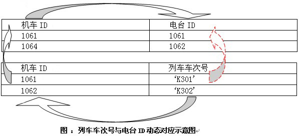 有了上述兩種對應(yīng)關(guān)系,我們就可以實(shí)現(xiàn)列車車次號(TRN)與電臺ID的動態(tài)對應(yīng)。請參見以下示意圖。