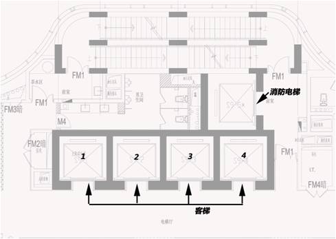 上海港國際客運(yùn)中心SB-9號樓電梯布局如下,A、B塔樓均有一個消防電梯和四個并列的客梯組成。