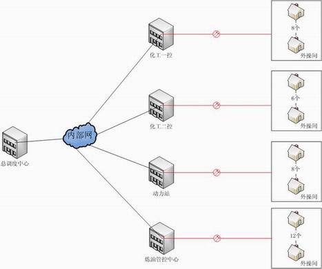 1) 無線對講系統(tǒng) 總調(diào)處采用5臺XiR R8200數(shù)字中繼臺,全部接入內(nèi)網(wǎng),通過合路器將5臺R8200中繼臺發(fā)射的信號合并成1路,通過分路器將接收的信號分配給5臺R8200中繼臺,信號經(jīng)過合路器及分路器的整合后再通過雙工器分離發(fā)射與接收信號,最后用饋線連接室外天線。 2) 有無線轉(zhuǎn)接系統(tǒng) 這5臺中繼臺分別接有無線轉(zhuǎn)接器,通過有無線轉(zhuǎn)接器接入PBX程控交換機,通過程控交換機與有線電話,手機互通。滿足總調(diào)應(yīng)急IP網(wǎng)、煉油廠應(yīng)急IP網(wǎng)、乙烯廠應(yīng)急IP網(wǎng)、電廠應(yīng)急IP網(wǎng)、消防IP網(wǎng)的有無線通信互通。 3) 數(shù)字調(diào)度系統(tǒng) 配置5個車載臺用于調(diào)度總調(diào)應(yīng)急IP網(wǎng)、煉油廠應(yīng)急IP網(wǎng)、乙烯廠應(yīng)急IP網(wǎng)、電廠應(yīng)急IP網(wǎng)、消防IP網(wǎng)五個無線對講通信網(wǎng)絡(luò)的用戶對講機。 系統(tǒng)工作模式及規(guī)劃 系統(tǒng)共使用5對12.5KHz帶寬的頻點,分別是乙烯廠應(yīng)急頻點,電廠應(yīng)急頻點,煉油廠應(yīng)急頻點,總調(diào)處應(yīng)急頻點,消防頻點。收發(fā)頻率間隔10MHz。系統(tǒng)規(guī)劃終端用戶50人,可任意設(shè)置多個通話組,各個通話組按照各部門相應(yīng)人員進行編制,并對各個組的組長進行權(quán)限配置。 3.1.2 化工一控系統(tǒng)組成
