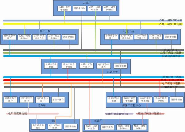 在同一物理局域網(wǎng)內(nèi)劃分10個邏輯IP鏈接網(wǎng)絡(luò),分別是總調(diào)應(yīng)急IP網(wǎng)、乙烯廠應(yīng)急IP網(wǎng)、乙烯廠調(diào)度IP網(wǎng)1、乙烯廠調(diào)度IP網(wǎng)2、煉油廠應(yīng)急IP網(wǎng)、煉油廠調(diào)度IP網(wǎng)1、煉油廠調(diào)度IP網(wǎng)2、電廠應(yīng)急IP網(wǎng)、電廠調(diào)度調(diào)度IP網(wǎng)、消防IP網(wǎng)。 - 總調(diào)應(yīng)急IP網(wǎng):總調(diào)處總調(diào)應(yīng)急中繼臺(主)、化工一控總調(diào)應(yīng)急中繼臺(從)、化工二控總調(diào)應(yīng)急中繼臺(從)、動力站總調(diào)應(yīng)急中繼臺(從)、煉油廠管控中心總調(diào)應(yīng)急中繼臺(從)共5臺;二期總調(diào)應(yīng)急頻道到下屬外操間均采用450M光纖直放站通過光纖進行信號延伸。 - 乙烯廠應(yīng)急IP網(wǎng):總調(diào)處乙烯廠應(yīng)急中繼臺(主)、化工一控乙烯廠應(yīng)急中繼臺(從)、化工二控乙烯廠應(yīng)急中繼臺(從)、乙烯廠的乙烯廠應(yīng)急中繼臺(從)共4臺;二期乙烯廠應(yīng)急頻道到下屬外操間均采用450M光纖直放站通過光纖進行信號延伸。 - 乙烯廠調(diào)度IP網(wǎng)1:化工一控乙烯廠調(diào)度中繼臺1(主)、化工二控乙烯廠調(diào)度中繼臺1(從)、乙烯廠的乙烯廠調(diào)度中繼臺1(從)共3臺;二期乙烯廠調(diào)度頻道1到下屬外操間均采用450M光纖直放站通過光纖進行信號延伸。 - 乙烯廠調(diào)度IP網(wǎng)2:化工一控乙烯廠調(diào)度中繼臺2(主)、化工二控乙烯廠調(diào)度中繼臺2(從)、乙烯廠的乙烯廠調(diào)度中繼臺2(從)共3臺;二期乙烯廠調(diào)度頻道2到下屬外操間均采用450M光纖直放站通過光纖進行信號延伸。 - 煉油廠應(yīng)急IP網(wǎng):總調(diào)處煉油廠應(yīng)急中繼臺(主)、煉油廠管控中心煉油廠應(yīng)急中繼臺(從)、煉油廠的煉油廠應(yīng)急中繼臺(從)共3臺;二期煉油廠應(yīng)急頻道到下屬外操間均采用450M光纖直放站通過光纖進行信號延伸。 - 煉油廠調(diào)度IP網(wǎng)1:煉油廠管控中心煉油廠調(diào)度中繼臺1(主)、煉油廠的煉油廠調(diào)度中繼臺1(從)共2臺;二期煉油廠調(diào)度頻道1到下屬外操間均采用450M光纖直放站通過光纖進行信號延伸。 - 煉油廠調(diào)度IP網(wǎng)2:煉油廠管控中心煉油廠調(diào)度中繼臺2(主)、煉油廠的煉油廠調(diào)度中繼臺2(從)共2臺;二期煉油廠調(diào)度頻道2到下屬外操間均采用450M光纖直放站通過光纖進行信號延伸。 - 電廠應(yīng)急IP網(wǎng):總調(diào)處電廠應(yīng)急中繼臺(主)、動力站電廠應(yīng)急中繼臺(從)、電廠的電廠應(yīng)急中繼臺(從)共3臺;二期電廠應(yīng)急頻道到下屬外操間均采用450M光纖直放站通過光纖進行信號延伸。 - 電廠調(diào)度調(diào)度IP網(wǎng):動力站電廠調(diào)度中繼臺(主)、電廠的電廠調(diào)度中繼臺(從)共2臺;二期電廠調(diào)度頻道到下屬外操間均采用450M光纖直放站通過光纖進行信號延伸。 - 消防IP網(wǎng):總調(diào)處消防中繼臺(主)、化工一控消防中繼臺(從)、化工二控消防中繼臺(從)、動力站消防中繼臺(從)、煉油廠管控中心消防中繼臺(從)共5臺;二期消防頻道到下屬外操間均采用450M光纖直放站通過光纖進行信號延伸。 結(jié)構(gòu)圖如下: