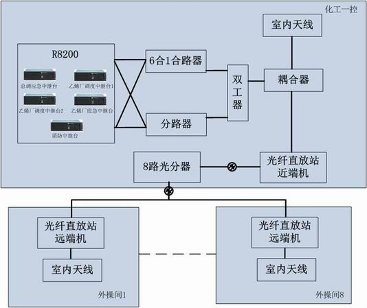 無線對講系統(tǒng) 化工一控采用5臺XiR R8200數(shù)字中繼臺,分別是總調(diào)應(yīng)急調(diào)度臺、乙烯應(yīng)急中繼臺、乙烯調(diào)度中繼臺1、乙烯調(diào)度中繼臺2、消防中繼臺,全部接入內(nèi)網(wǎng),通過合路器將這5臺R8200中繼臺發(fā)射的信號合并成1路,通過分路器將接收的信號分配給5臺R8200中繼臺,信號經(jīng)過合路器及多路耦合器的整合后通過雙工器分離發(fā)射與接收信號,再由雙工器將射頻信號接入耦合器,耦合器一路將信號接入室內(nèi)天線,一路接入直放站近端機,使用光纖直放站進行傳輸。 直放站信號傳輸 射頻信號進入直放站近端機后,通過光電轉(zhuǎn)化,將射頻信號轉(zhuǎn)化成光信號,通過光纖進行傳輸,通過1分8的光分器,將光纖信號分為8路,分別連接8個外操間的光纖直放站遠端機,將光信號轉(zhuǎn)化成射頻信號后接入室內(nèi)天線。 系統(tǒng)工作模式及規(guī)劃 系統(tǒng)共使用5對12.5KHz帶寬的頻點,分別是總調(diào)應(yīng)急頻點、乙烯廠應(yīng)急頻點、乙烯廠調(diào)度頻點1、乙烯廠調(diào)度頻點2、消防頻點。收發(fā)頻率間隔10MHz。系統(tǒng)規(guī)劃終端用戶30人,可任意設(shè)置多個通話組,各個通話組按照各部門相應(yīng)人員進行編制,并對各個組的組長進行權(quán)限配置。 3.1.3 化工二控系統(tǒng)組成
