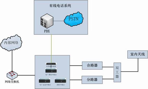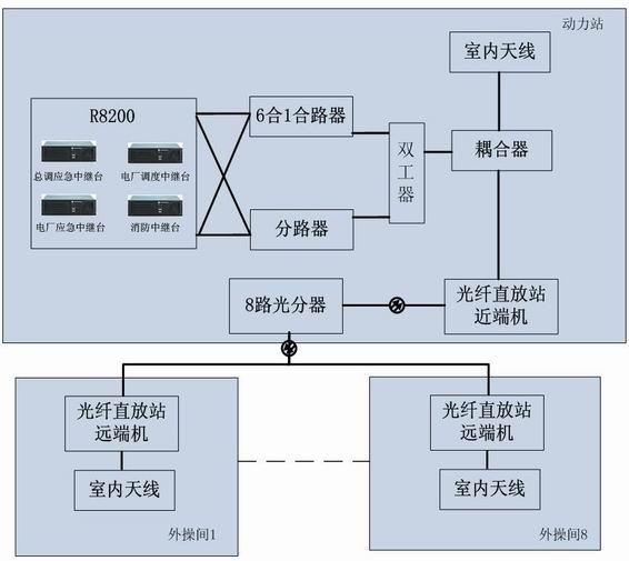 無線對講系統(tǒng) 工二控采用5臺XiR R8200數(shù)字中繼臺,分別是總調(diào)應(yīng)急調(diào)度臺、乙烯應(yīng)急中繼臺、乙烯調(diào)度中繼臺1、乙烯調(diào)度中繼臺2、消防中繼臺,全部接入內(nèi)網(wǎng),通過合路器將這5臺R8200中繼臺發(fā)射的信號合并成1路,通過分路器將接收的信號分配給5臺R8200中繼臺,信號經(jīng)過合路器及多路耦合器的整合后通過雙工器分離發(fā)射與接收信號,再由雙工器將射頻信號接入耦合器,耦合器一路將信號接入室內(nèi)天線,一路接入直放站近端機,使用光纖直放站進行傳輸。 直放站信號傳輸 射頻信號進入直放站近端機后,通過光電轉(zhuǎn)化,將射頻信號轉(zhuǎn)化成光信號,通過光纖進行傳輸,通過1分6的光分器,將光纖信號分為6路,分別連接6個外操間的光纖直放站遠端機,將光信號轉(zhuǎn)化成射頻信號后接入室內(nèi)天線。 系統(tǒng)工作模式及規(guī)劃 系統(tǒng)共使用5對12.5KHz帶寬的頻點,分別是總調(diào)應(yīng)急頻點、乙烯廠應(yīng)急頻點、乙烯廠調(diào)度頻點1、乙烯廠調(diào)度頻點2、消防頻點。收發(fā)頻率間隔10MHz。系統(tǒng)規(guī)劃終端用戶30人,可任意設(shè)置多個通話組,各個通話組按照各部門相應(yīng)人員進行編制,并對各個組的組長進行權(quán)限配置。 3.1.4 動力站系統(tǒng)組成