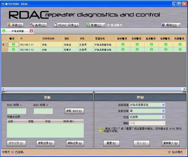 2、RDAC中繼臺(tái)診斷、控制軟件 該軟件為數(shù)字通訊系統(tǒng)安全穩(wěn)定運(yùn)行提供了保證。RDAC網(wǎng)管工具軟件可對(duì)中繼臺(tái)提供遠(yuǎn)程管理,如檢測(cè)中繼臺(tái)的風(fēng)扇警報(bào)、電源警報(bào)、溫度警報(bào),遠(yuǎn)程讀取RSSI值、發(fā)射功率,讀取記錄,重啟中繼臺(tái),重寫(xiě)信道等。