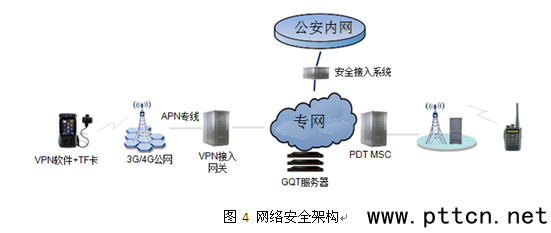 (3)終端融合,通過PDT+3G/4G多模終端實現專網終端和公網終端的融合。終端優先接入PDT網絡,脫離PDT網絡覆蓋范圍后可以接入公網;任何時候可以使用公網傳輸視頻等寬帶業務。 (4)安全加密 可以參照或直接采用警務通的網絡安全和加密傳輸方案,實現終端接入安全控制、網絡安全隔離和音視頻信息傳輸加密等功能。 如圖4所示,集群通終端通過VPN安全接入網關接入到公安專網的“安全接入平臺”。集群通終端采用專用APN接入點,3G/4G移動網通過APN專線連接到公安接入安全平臺,并通過VPN安全接入網關連接到PDT專網。集群通業務承載在VPN加密信道上連接到部署在PDT專網內的GQT服務器。 GQT服務器和PDT核心網(MSC)在IP專網內通過pSIP協議互聯。 PDT專網核心網通過安全接入系統與公安內網連接。