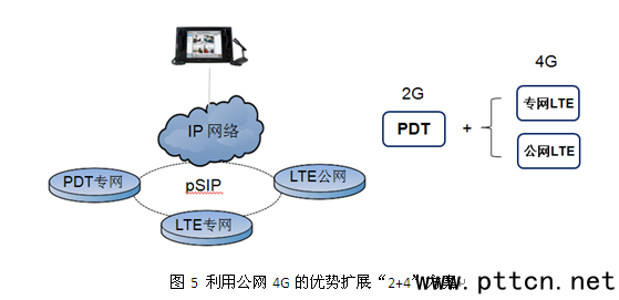 2.集群通與警用數字集群通信(PDT)專網系統融合解決方案 如圖3所示,集群通系統可以通過pSIP接口協議與PDT專網系統互聯,實現集群語音和窄帶數據業務的融合。 集群通和PDT的融合分為三個層次,即業務融合、網絡融合和終端融合。 (1)業務融合,在調度臺業務層面,實現專網或公網接入無關,專網接入的終端和公網接入的終端可以編入相同的工作組,接受相同的調度業務。pSIP協議目前只定義了語音和窄帶數據業務,將來可以擴展支持寬帶視頻業務,F階段,調度臺可以通過MSC實現窄帶調度業務,同時增加一個直接連接GQT Server的接口支持視頻業務。 (2)網絡融合,公網和專網無線接入網絡的融合可以達到以下三個目的: ü 實現專網的覆蓋延伸,由于公網的廣域覆蓋特征,可以彌補專網的覆蓋盲區,包括深度室內覆蓋和遠離城市的郊區覆蓋; ü 用戶容量擴展,利用公網的低成本、大容量優勢,可以有效解決公安領域非核心干警人員的裝備使用問題; ü 業務補充,利用3G/4G公網的寬帶傳輸能力,快速有效解決寬帶視頻業務的傳輸問題,補充PDT系統的視頻業務能力。