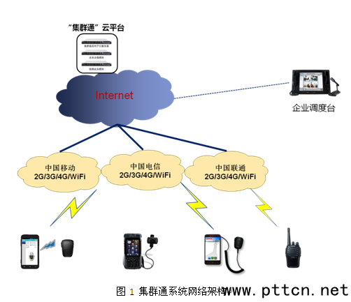 主頁(http://www.130131.com):“集群通”與公安PDT專網融合解決方案 1.集群通(GQTone)簡介 集群通是基于3G/4G移動公網的寬帶多媒體集群系統,具有群組對講(PTT)、音視頻會議、實時視頻傳送與轉分發、圖片和視頻拍傳、GPS定位、移動視頻監控等多媒體指揮調度功能,終端應用軟件支持Android、iOS操作系統,可基于用戶級別、群組和權限進行管理。 集群通系統的網絡架構如圖1所示,由部署在云端的集群通業務平臺、基于智能手機的客戶端應用軟件和企業調度臺軟件構成,是一種基于OTT業務模式的移動互聯網行業應用系統。