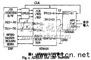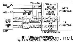 ![]() 傳統(tǒng)的短波電臺由于頻率資源擁擠,時變電離層信道嚴重的頻率選擇性衰落以及多徑時延、各種大氣噪聲以及人為無線電噪聲的影響,只適合于傳輸模擬話音以及低速率數(shù)據(jù)。隨著現(xiàn)代無線通信理論與軟硬件技術(shù)的發(fā)展以及對電離層信道特性的深入探索,短波電臺出現(xiàn)了以下幾方面的變化:①采用跳頻技術(shù)來提高抗干擾能力;②采用自適應(yīng)通信技術(shù)來提高建鏈能力;③數(shù)據(jù)通信(包括圖文數(shù)據(jù)及聲碼話數(shù)據(jù)等)成為重要的業(yè)務(wù)方式;④采用數(shù)字加密方式等。 理論上就目前ADC的速度而言能夠滿足對短波波段信號進行低通采樣,但直接在射頻端進行A/D轉(zhuǎn)換存在以下問題。①嚴重影響接收機的選擇性和靈敏度,一般射頻頻段內(nèi)會存在若干強窄帶干擾,為防止超載并降低ADC的量化噪聲,ADC必須具有大動態(tài)范圍,而當信號很弱接近噪聲基底時,ADC的無寄生動態(tài)范圍SFDR指標決定了接收機總的SNR,ADC的實現(xiàn)難度很大;②短波波段帶寬較寬,ADC前的寬帶抗混疊濾波器與寬帶放大器目前性能還不夠理想;③ 數(shù)字信號處理器對射頻段窄帶信號進行信道分離解調(diào)難度很大;④ADC采樣孔徑抖動引起的信噪比惡化相對嚴重。因此,目前對傳統(tǒng)短波電臺的數(shù)字化改造大都保留了電臺的射頻以及模擬混頻環(huán)節(jié),而在頻率較低并且固定的二中頻處進行。 本文中我們設(shè)計的短波中頻數(shù)字化平臺是在二中頻500kHz處進行數(shù)字化,從而省去傳統(tǒng)電臺的邊帶濾波等一系列模擬解調(diào)環(huán)節(jié),構(gòu)筑一個統(tǒng)一的硬件平臺實現(xiàn)單邊帶、調(diào)幅、等幅報音等的軟件調(diào)制解調(diào),并在此基礎(chǔ)上加載跳頻、自適應(yīng)、并行及串行Modem 數(shù)傳等調(diào)制解調(diào)模塊。短波中頻數(shù)字化平臺結(jié)構(gòu)原理如圖2所示。其中,N-RT為準實時和實時;信源/信宿包括窄帶業(yè)務(wù)與未來的寬帶業(yè)務(wù)。 1 數(shù)字變頻技術(shù) ![]() 從圖2可以看出,從中頻采樣信號到基帶信號是通過數(shù)字變頻來完成的,數(shù)字變頻技術(shù)是軟件無線電的核心技術(shù)之一,涉及到多抽樣率數(shù)字信號處理 (MRDSP:multiratedigitalsignalprocessing)技術(shù),后者是自20世紀70年代開始發(fā)展起來的數(shù)字信號處理領(lǐng)域的一門重要技術(shù)。數(shù)字變頻器主要由數(shù)字混頻器、數(shù)控振蕩器和低通濾波器3部分組成。數(shù)字變頻采用正交混頻,而且需要對信號進行重采樣抽取或者內(nèi)插濾波(此處的抽取濾波包括2步操作,首先是抗混疊低通濾波,然后是樣點的抽取;內(nèi)插濾波則先是樣點的內(nèi)插,然后是抑制鏡頻的低通濾波)。因為中頻接收信號經(jīng)過正交混頻以后已變?yōu)榛鶐盘枺藭r信號只在中頻采樣頻帶(二分之一中頻采樣率)內(nèi)占很小一部分,經(jīng)低通抽取濾波后可以在保持信號不受影響的情況下降低數(shù)據(jù)速率(降為基帶采樣率),有助于減輕后端數(shù)字信號處理壓力;對于發(fā)送通道在正交混頻之前必須先進行內(nèi)插濾波以提高信號的數(shù)據(jù)率,使之至少達到奈奎斯特采樣定理要求的兩倍信號最高頻率,否則會產(chǎn)生嚴重的混疊。 在模擬變頻中,混頻器的非線性和模擬本振的頻率穩(wěn)定度,邊帶、相位噪聲、溫度漂移、轉(zhuǎn)換速率等都是人們最關(guān)心和難以徹底解決的問題,這些問題在數(shù)字變頻中是不存在的,頻率步進、頻率間隔等也具有理想的性能。和模擬變頻器相比,數(shù)字變頻還具有以下優(yōu)點:①載頻與數(shù)字濾波器系數(shù)具有可編程性;②數(shù)字混頻不存在非線性失真,因而互調(diào)小;③數(shù)字濾波頻響特性好;④系統(tǒng)造價低等。 目前市場上有大量專為數(shù)字變頻而設(shè)計的專用可編程數(shù)字信號處理器,如Intersil公司的 HSP50214/215,HSP50415,Graychip公司的GC1012,GC4014以及AD公司的AD9856,AD6620/22/24 等,這些芯片指令集較為簡單,速度也較快,并且處理效率更高。本文中我們設(shè)計的中頻數(shù)字化平臺即采用了兩塊專用的數(shù)字變頻芯片:HSP50415和 AD6620。 HSP50415是Intersil公司單路數(shù)字上變頻芯片,該芯片具有很強的調(diào)制能力,內(nèi)部主要由內(nèi)插濾波器、復(fù)調(diào)制器、定時和載波數(shù)控振蕩器、雙12位150M采樣率D/A轉(zhuǎn)換器四部分組成。采樣率轉(zhuǎn)換包括3級內(nèi)插濾波器,內(nèi)插范圍4~128K;支持正交AM及PM調(diào)制;提供脈沖成形濾波以及星座圖映射等;該芯片最大輸出采樣率100MSPS,最大輸入速率25MSPS,前端具有256級深度的FIFO;32位可編程數(shù)控振蕩器提供最大 50MHz載波和0.023Hz頻率精度。 該芯片內(nèi)部共有16個控制寄存器和4個觸發(fā)選通寄存器,還有多個可配置RAM塊,有2個外部接口,uP NT ER FA CE用于芯片配置以及初始化,DATAINTERFACE用于I,Q正交數(shù)據(jù)輸入。圖3給出了一種該芯片和TM S320C54x的參考接口電路。芯片配置時,由于內(nèi)部控制寄存器大都是32位字長,而uP接口只有8位寬,每個控制字需要連續(xù)加載4次才能完成,在此期間,片選線和讀寫線都必須保持有效狀態(tài)。數(shù)據(jù)輸入時,根據(jù)驅(qū)動時鐘DATACL K的產(chǎn)生不同,有同步和異步兩種方式,前者直接把HSP5