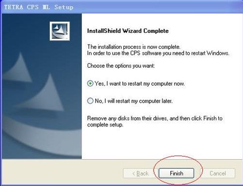 點(diǎn)擊安裝文件中的安裝圖標(biāo) ,同意使用協(xié)議,點(diǎn)擊“Browse”選擇安裝目錄,建立程序安裝文件夾(默認(rèn)TETRA CPS ML)。并且在桌面建立一個(gè)快捷方式,輸入安裝文件名稱(默認(rèn)TetraCPS),開始安裝軟件,點(diǎn)擊“Finish”(如圖1所示),計(jì)算機(jī)將自動(dòng)重啟,安裝完成。