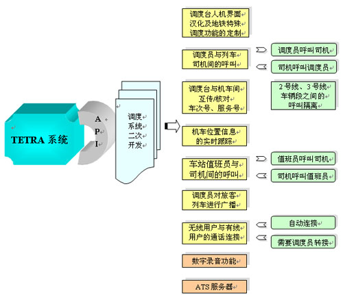 圖5. 二次開發(fā)軟件功能模塊規(guī)劃 從圖5上可以看出,利用系統(tǒng)所提供的應(yīng)用程序接口(API)作為開發(fā)平臺,將右邊兩列二次開發(fā)的各個功能軟件模塊與TETRA系統(tǒng)連接起來,實(shí)現(xiàn)雙方的信息交互和控制,實(shí)現(xiàn)地鐵運(yùn)營所需要的各項(xiàng)功能。其主要功能如下: 調(diào)度員能夠使用機(jī)車號、車次號、車組號等信息對機(jī)車進(jìn)行呼叫; 調(diào)度員能夠?qū)囌九_呼叫; 調(diào)度員能夠?qū)φ機(jī)車進(jìn)行廣播通話; 調(diào)度員能夠?qū)φ上的上行或下行列車發(fā)起呼叫; 行車調(diào)度臺與環(huán)控(防災(zāi))調(diào)度臺、段場值班員之間的通話; 調(diào)度員能夠與管轄的機(jī)車臺進(jìn)行緊急呼叫; 調(diào)度員發(fā)送調(diào)度命令;