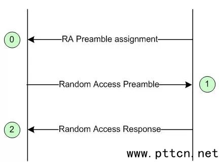 1)UE在RACH上發(fā)送隨機接入前綴; 2)ENb的MAC層產(chǎn)生隨機接入響應(yīng),并在DL-SCH上發(fā)送; 3)UE的RRC層產(chǎn)生RRC Connection Request 并在映射到UL –SCH上的CCCH邏輯信道上發(fā)送; 4)RRC Contention Resolution 由ENb的RRC層產(chǎn)生,并在映射到DL –SCH上的CCCH or DCCH(FFS)邏輯信道上發(fā)送。 基于非沖突的隨機接入: