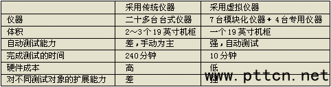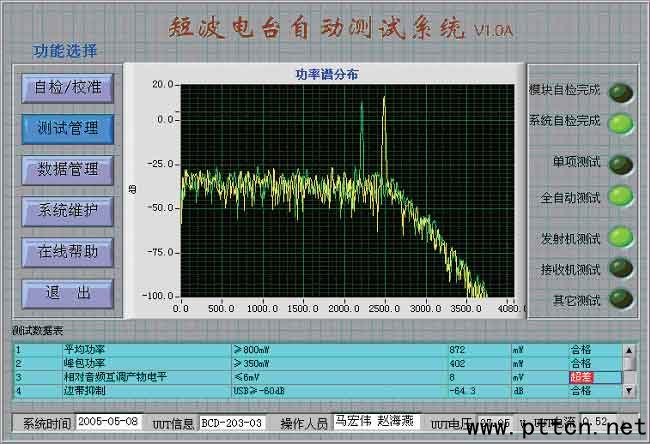 圖3 用戶界面 基于虛擬儀器技術(shù)所開發(fā)的應(yīng)用軟件具有良好的人機(jī)界面、可維護(hù)性和二次開發(fā)能力,可以有效地縮短程序開發(fā)的工作量,極大地縮短開發(fā)時(shí)間,只需要對(duì)程序做少量的改動(dòng)就可以實(shí)現(xiàn)新的功能和要求,從而可以滿足不同階段,不同種類的電臺(tái)自動(dòng)測試的需要,二次開發(fā)、功能擴(kuò)展極為方便。 結(jié)論 表1反映了采用虛擬儀器前后短波電臺(tái)測試系統(tǒng)的變化。通過選用基于虛擬儀器的短波電臺(tái)自動(dòng)測試系統(tǒng),使得測試系統(tǒng)的自動(dòng)化程度和測試精度得到了極大的進(jìn)步,減少了人為操縱引起的誤差,通過在生產(chǎn)線上使用有效地進(jìn)步了生產(chǎn)和檢測的效率,通過系統(tǒng)配置和適當(dāng)?shù)臄U(kuò)展,可以適應(yīng)多種不同類型電臺(tái)的測試需要。