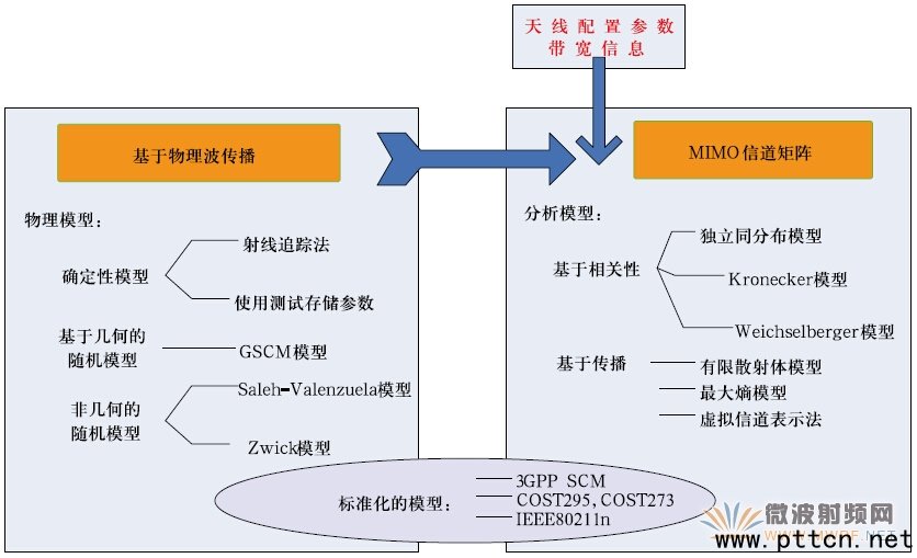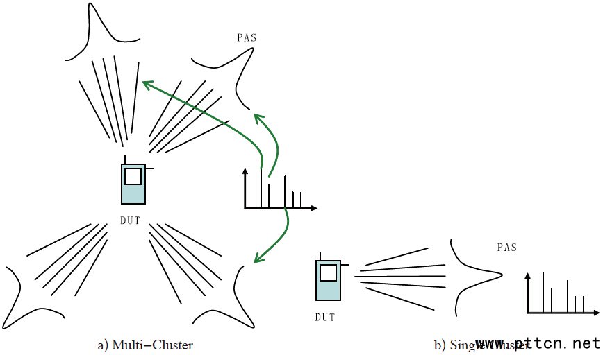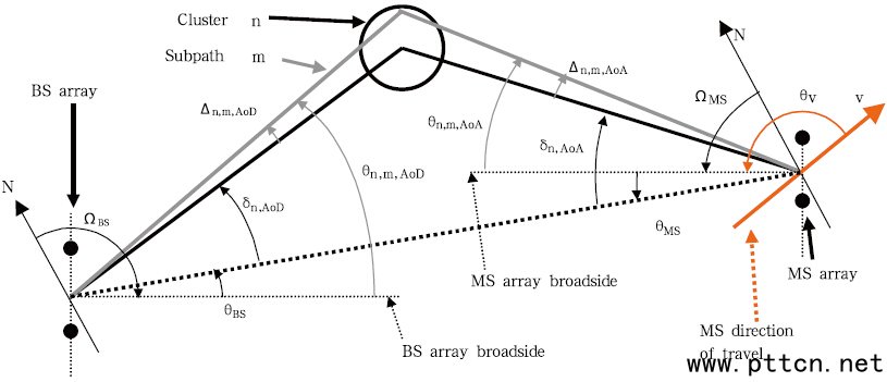 圖1、信道模型的分類 GSCM 類信道模型的重要特點(diǎn)是可以將天線與傳播環(huán)境分離[8],與此相反基于相關(guān)性矩陣的信道模型則無(wú)法將信道與天線特性分離,所以原則上無(wú)法用于重建測(cè)試終端性能的信道模型——但TGn 模型[7]雖然基于相關(guān)性矩陣,其中含有幾何信息的描述,這使得在MIMO OTA 中復(fù)現(xiàn)TGn 變?yōu)榭赡。換句話說(shuō),在MIMO OTA 多探頭方法當(dāng)中,信道的重建是基于各來(lái)波特性進(jìn)行合成,這些來(lái)波可以具有各自的時(shí)延、多普勒頻移,到達(dá)角(AoA)、離開(kāi)角(AoD)等,合成后將在終端天線單元陣列上體現(xiàn)出信道的空域相關(guān)性,及與信道幾何特性相關(guān)的多普勒譜——芯片對(duì)這些信道特性的辨析與優(yōu)化,最終將影響到終端性能。[3][4][5][6] 均屬于此類信道模型。 1.2、SCM 與SCME 模型 提到現(xiàn)代MIMO 信道建模,尤其是GSCM 信道模型,我們不得不提到3GPP SCM(Spatial Channel Model)模型[3]及歐洲WINNER(Wireless World INitiative NEw Radio)項(xiàng)目[5]。在2003 年3GPP TR25.996 描述的SCM 模型當(dāng)中,傳統(tǒng)的TDL(Tap Delay Line)模型被進(jìn)一步解析為以簇來(lái)描述的CDL(Cluster Delay Line)模型。SCM 中定義了6 束來(lái)波,每一束被稱為一個(gè)簇(Cluster),每一簇來(lái)波由20 個(gè)子徑(sub-path)構(gòu)成,每個(gè)簇除了定義了各自的AoD 和AoA 以外,還根據(jù)實(shí)際信道測(cè)試的結(jié)論,定義了水平面上的能量分布,如拉普拉斯分布,即角度功率譜(PAS,Power Azimuth Spectral),其方差被定義為角度擴(kuò)展(AS,Angular Spread);同時(shí),每一簇模型具有各自的AoA,AoD,時(shí)延,多普勒譜等特性。SCM 比較好地貼近了實(shí)測(cè)數(shù)據(jù),并且能夠從時(shí)域、頻域、空間域及極化域反映MIMO 信道的特點(diǎn),圖2 中對(duì)SCM 模型的參數(shù)進(jìn)行了簡(jiǎn)介[3]。