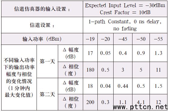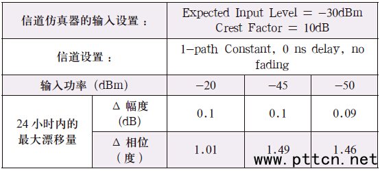 表4、信道仿真器的輸入設(shè)置對(duì)系統(tǒng)穩(wěn)定性的影響 (EIL-20) ≤INPUT ≤(EIL+CE) (7) 也即輸入功率應(yīng)該盡量接近期待功率(EIL),其變化范圍最小應(yīng)大于設(shè)置的期待功率20dB以上,最大則不能比設(shè)置的期待功率的峰均比(CF)更大,否則系統(tǒng)的不確定將增大。對(duì)于信道仿真器的信號(hào)漂移,在符合式(7)的情況下,表5 的測(cè)試結(jié)果證明信道仿真器輸出信號(hào)的幅度漂移不超過(guò)0.1dB,相位變化不超過(guò)1.5 度,因此我們可以認(rèn)為信道仿真器在整個(gè)測(cè)試過(guò)程中是較為穩(wěn)定的。