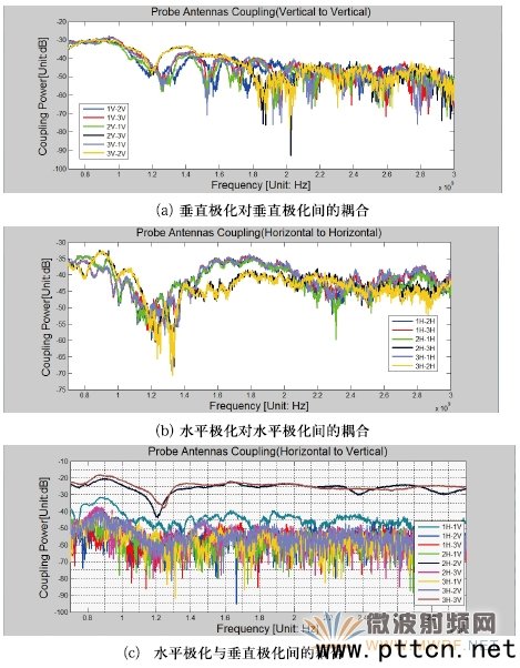圖13、功率放大器各通道的信號(hào)漂移(長(zhǎng)期) 3.2.4、多探頭之間的耦合情況 對(duì)于多探頭系統(tǒng),天線探頭之間的互相耦合可能會(huì)影響到測(cè)試結(jié)果,這種影響的評(píng)估在尺寸較小的暗室配置中顯得更為重要,在ABP MIMO OTA 單簇法系統(tǒng)中使用到了3 個(gè)雙極化的天線探頭,我們分別對(duì)3 個(gè)天線的兩種極化做了測(cè)試,測(cè)試結(jié)果見(jiàn)圖14,測(cè)試結(jié)果表明最大的耦合發(fā)生在3 號(hào)天線的垂直與水平極化之間,在1.2GHz 約為-18dB,其他耦合一般小于-30dB。