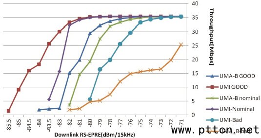 圖16、ABP 單簇法信道模型的驗(yàn)證:空間相關(guān)性 3.4、測(cè)試區(qū)域內(nèi)的信號(hào)功率與SIR 驗(yàn)證 在目前的MIMO OTA 針對(duì)吞吐量測(cè)試,必須對(duì)測(cè)試區(qū)域內(nèi)的參考測(cè)試信號(hào)功率(RS-EPRE)及SIR 值進(jìn)行驗(yàn)證,否則不同實(shí)驗(yàn)室之間的測(cè)試數(shù)據(jù)無(wú)法進(jìn)行統(tǒng)一和比較。參考文獻(xiàn)[41]、[42]、[43] 中列舉了測(cè)試功率及SIR 的定義和驗(yàn)證方法。 廣播電視規(guī)劃院的單簇MIMO OTA 系統(tǒng)的信號(hào)功率與SIR 驗(yàn)證結(jié)果在參考文獻(xiàn)[39] 中已列舉,摘錄如下:在測(cè)試區(qū)域中的RS-EPRE 的計(jì)算值與實(shí)際測(cè)試值之間差異為-0.34861 dB ;在UMi、UMa/A、UMa/B 信道模型下,測(cè)試區(qū)域中的SIR 目標(biāo)值與實(shí)際測(cè)試值之間的差異分別為-0.28dB,-0.58dB 及-0.47dB。 3.5、實(shí)際測(cè)試結(jié)果 在CTIA 開(kāi)展的第二輪比對(duì)測(cè)試當(dāng)中,廣播電視規(guī)劃院利用建立的單簇法MIMO OTA 測(cè)試系統(tǒng)對(duì)送樣的3 類天線及其終端進(jìn)行了測(cè)試,測(cè)試結(jié)果表明單簇法可以很好地將3 個(gè)終端進(jìn)行區(qū)分,不同的信道模型對(duì)終端吞吐量的影響也清晰可辨(圖17) 。