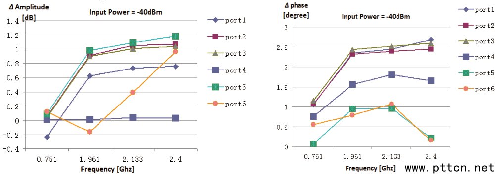 圖12、功率放大器的增益及線性范圍 功率放大器的長(zhǎng)期信號(hào)漂移是描述對(duì)應(yīng)于實(shí)驗(yàn)室在兩個(gè)工作時(shí)段,這決定了實(shí)驗(yàn)室是否能夠在幾周甚至幾個(gè)月時(shí)長(zhǎng)內(nèi),沿用同一個(gè)校準(zhǔn)數(shù)據(jù)。我們的摸底測(cè)試是在兩個(gè)工作日,對(duì)功率放大器分別重新啟動(dòng)、預(yù)熱30 分鐘之后,輸入設(shè)置統(tǒng)一分別設(shè)置為-40dBm(線性區(qū)間之內(nèi)),測(cè)試功率放大器的六個(gè)通道,在不同的頻率點(diǎn)的輸出信號(hào)幅度與相位的差異值,測(cè)試結(jié)果見(jiàn)圖13,測(cè)試結(jié)果表明兩次測(cè)試功率放大器最大的信號(hào)幅度漂移可能超過(guò)1dB,相位漂移則相對(duì)較小,這意味著系統(tǒng)在不同的工作時(shí)間,測(cè)量不確定可能會(huì)由于功率放大器的信號(hào)漂移而大幅增大,因此我們建議系統(tǒng)應(yīng)該進(jìn)行日常校準(zhǔn)工作,即校準(zhǔn)文件需要經(jīng)常進(jìn)行更新。 功率放大器的短期信號(hào)漂移是描述對(duì)應(yīng)于某一次測(cè)試過(guò)程中,如40 分鐘,輸出信號(hào)的變化,我們記錄到40 分鐘最大的信號(hào)幅度變化在0.1dB 以下,這證明在同一次測(cè)試過(guò)程中,功率放大器的信號(hào)漂移不會(huì)對(duì)系統(tǒng)測(cè)試結(jié)果產(chǎn)生影響。