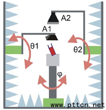 圖8、基于分解法的測(cè)試方案(德國(guó)R&S 公司) 分解法曾經(jīng)被稱為兩通道法,意即在測(cè)試過(guò)程中,有兩個(gè)發(fā)射天線將基站模擬器的信號(hào)發(fā)送給DUT,DUT 在水平面旋轉(zhuǎn),而兩個(gè)探頭在垂直面上同時(shí)動(dòng)作,他們首先遇到的一個(gè)問(wèn)題在于DUT 測(cè)試位置(角度)與發(fā)射天線位置的選擇。 此外,R&S 的工程師聲稱此方法區(qū)別于多探頭全環(huán)法,在于“分解法是一種3D 的測(cè)試方法,而多探頭全環(huán)只做水平面2D 測(cè)試”,然而實(shí)際上,首先他們曲解了3D 信道模型的概念,另一方面,即使是分解法,在同一時(shí)刻,兩個(gè)發(fā)射天線與DUT實(shí)際上是在同一個(gè)平面之上。 在3GPP RAN4 的2013 年11 月一次會(huì)議當(dāng)中,該方法未被列入正文。 2.2、多探頭方案國(guó)際研究動(dòng)態(tài)與演進(jìn) 從測(cè)試方法的角度上,對(duì)于基于信道仿真器與暗室、多探頭的方案,來(lái)自各國(guó)的研究者各自獨(dú)立地上做過(guò)大量的研究:芬蘭Pekka Kyösti 在參考文獻(xiàn)[8] 中詳細(xì)闡述了多探頭方案的原理,其中包含兩個(gè)信號(hào)合成方法:平面波合成(WFS, Wave Field Synthesis)與預(yù)衰落合成(PFS, Pre-Faded signal Synthesis);美國(guó)Spirent 公司John Douglas Reed 在參考文獻(xiàn)[30]中闡述使用MIMO OTA 的方法對(duì)空間相關(guān)性進(jìn)行重現(xiàn);丹麥Aalborg 大學(xué)Gert Pedersen 教授帶領(lǐng)他的團(tuán)隊(duì)與Intel 公司合作,自行搭建了暗室、多探頭和測(cè)試軟件,對(duì)SCME 等信道模型下LTE 終端的測(cè)試方法進(jìn)行了研究,并對(duì)多探頭方案的系統(tǒng)配置和驗(yàn)證給出了測(cè)試結(jié)果[31]~[33];美國(guó)Apple 公司Matt A.Mow 等人對(duì)終端在MIMO OTA 測(cè)試過(guò)程中與傳導(dǎo)測(cè)試中的一致性比較方法進(jìn)行研究,并申請(qǐng)了專利[34]。芬蘭原赫爾辛基大學(xué)Tommi Latinen 等對(duì)平面波合成的多探頭數(shù)量進(jìn)行了研究[35] ;日本松下公司與東京理工大學(xué)的研究證明了使用信道模擬器和多探頭的方法能夠產(chǎn)生準(zhǔn)確的射頻信道模型,從而利用可控的空域相關(guān)性對(duì)MIMO 信道容量進(jìn)行研究變?yōu)榭赡?sup>[36],他們同時(shí)也給出了系統(tǒng)設(shè)計(jì)以及校準(zhǔn)流程的建議[37];英國(guó)Anite(前芬蘭Elektrobit)公司很早就展開(kāi)了MIMO OTA測(cè)試可行性的研究,將仿真和實(shí)測(cè)結(jié)果與參考模型特性進(jìn)行了對(duì)比,結(jié)果表明在大多數(shù)情況下OTA 與參考模型具有很高的一致性,證明了在暗室中可以產(chǎn)生所需的無(wú)線信道傳播特性[38]。 從信道模型的角度上,2000 年開(kāi)始,基于射線的多天線信道模型就開(kāi)始從Tap Delay Line 向Cluster Delay Line 過(guò)渡,2003 年3GPP TR 25.996 中定義了SCM,歐洲WINNER 項(xiàng)目進(jìn)一步推動(dòng)并細(xì)化了基于幾何的隨機(jī)信道模型GSCM 的發(fā)展。目前,雖然各個(gè)MIMO OTA 方案都在聲稱自己的優(yōu)越性,但一個(gè)不爭(zhēng)的事實(shí)是,多探頭的信道模型是早于MIMO OTA方案就被工業(yè)與學(xué)術(shù)界認(rèn)可,而其他幾個(gè)測(cè)試方案一方面對(duì)于電波傳播與信道模型涉及不多,另一方面都在將自己的測(cè)試結(jié)果與多探頭系統(tǒng)看齊。 大約從2008 年開(kāi)始,全球范圍內(nèi)有三個(gè)關(guān)注多入多出信道測(cè)試、建模以及MIMO OTA 測(cè)試的學(xué)術(shù)與標(biāo)準(zhǔn)化組織,分別在各自的范圍內(nèi)對(duì)以上技術(shù)和論題展開(kāi)交流和討論,他們是:
