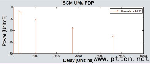 1963 年Bello 在[20] 中, 針對(duì)廣義平穩(wěn)非相關(guān)環(huán)境(WSSUS)前提下的時(shí)變沖擊響應(yīng)及傳輸函數(shù)、信道相關(guān)性函數(shù)之間的轉(zhuǎn)換關(guān)系進(jìn)行了研究,成為信道測(cè)量與驗(yàn)證的理論基礎(chǔ)。 1.3、MIMO 信道參數(shù) 在本節(jié)中我們基于幾何的隨機(jī)信道模型的概念,介紹用于描述MIMO 信道特點(diǎn)的主要參數(shù),它們是時(shí)延特性(PDP,Power Delay Profile),多普勒譜,空間相關(guān)性(Spatial Correlation),及信道的交叉極化比(XPR,Cross-Polarization Ratio)。由于這四個(gè)參數(shù)刻畫了MIMO 系統(tǒng)在信道的頻域、時(shí)域、空域及極化域的重要特性,被認(rèn)為代表或涵蓋了MIMO信道的主要特征,因此它們也被CTIA 及3GPP 采納作為MIMO OTA 系統(tǒng)驗(yàn)證的四個(gè)主要參數(shù)[13][14][15]。 1.3.1、時(shí)延特性(PDP,Power Delay Profile) 對(duì)于一個(gè)線性時(shí)變的信道來(lái)說(shuō),信道的沖擊響應(yīng)雖然可以由其自相關(guān)函數(shù)來(lái)描述,但出于簡(jiǎn)化的目的,在大量的MIMO 信道測(cè)量過(guò)程中,常以時(shí)延功率譜來(lái)描述信號(hào)不同時(shí)延的能量分布,圖3 是一個(gè)標(biāo)準(zhǔn)的SCM 城市宏小區(qū)(UMa, Urban Macro)信道模型的PDP譜。