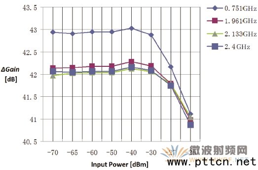 表5、信道仿真器信號(hào)漂移研究(長(zhǎng)期) 3.2.3、功率放大器特性及信號(hào)漂移 用于補(bǔ)償路徑衰減的功率放大器其通道數(shù)與信道仿真器相同,其特性同樣對(duì)整個(gè)系統(tǒng)的不確定度產(chǎn)生影響。通常,功率放大器需要有30 分鐘的預(yù)熱時(shí)間,在這段時(shí)間內(nèi),其輸出信號(hào)幅度可能有0.5dB~1dB 的變化,30 分鐘后輸出將趨穩(wěn),因此我們推薦整個(gè)系統(tǒng)的預(yù)熱時(shí)間一般在30 分鐘,之后再做所有其他的驗(yàn)證或測(cè)試工作。 在開(kāi)始測(cè)試之前,必須獲取功率放大器的線性工作區(qū)間,我們對(duì)所用到的功率放大器進(jìn)行了四個(gè)頻點(diǎn)不同輸入功率的測(cè)試,其增益測(cè)試結(jié)果見(jiàn)圖12,從圖中可以看出輸入功率大于-30dBm 時(shí)將逐漸進(jìn)入1dB 壓縮點(diǎn),因此我們所有后續(xù)工作中,將使得功率放大器的輸入功率控制在-30dBm 以下。