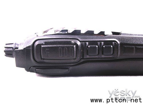 CS-800機(jī)身左側(cè)的按鈕 CS-800把最常用的按鈕都設(shè)計(jì)在機(jī)身的左側(cè),其中最大的按鈕便是對講按鈕PTT,講話的時(shí)候按住PTT按鈕,講完之后放開按鈕即可完成通話信號的發(fā)送。PTT按鈕下面則是MONI監(jiān)聽按鈕和搜索按鈕,按住后就可以搜索信道以及監(jiān)聽信道內(nèi)的情況。