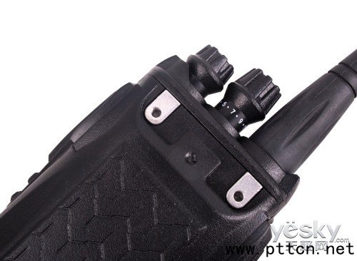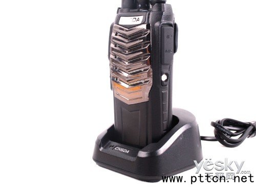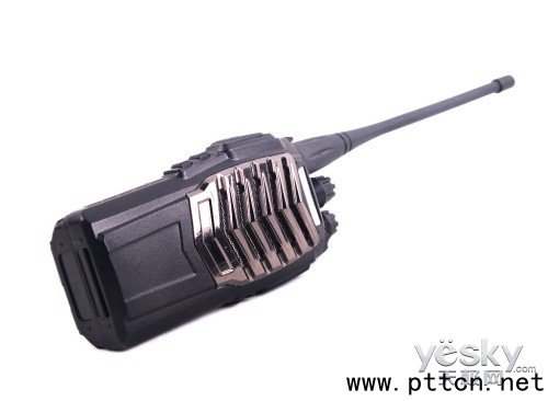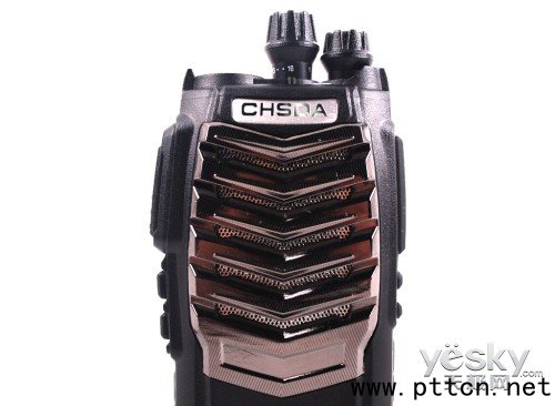 馳迅達(dá)CS-800對講機(jī) 馳迅達(dá)CS-800外觀造型充滿了陽剛之氣,機(jī)身大部分仍采用全黑的色調(diào),外殼采用了磨砂材質(zhì)的高強(qiáng)度工程塑料,握持感好而且堅(jiān)固耐用。灰黑色揚(yáng)聲器網(wǎng)罩采用了整塊金屬鏤空出多個(gè)V字型,頗有變形金剛狂派的味道,不過這也增加了整機(jī)的重量,有明顯的壓手感。