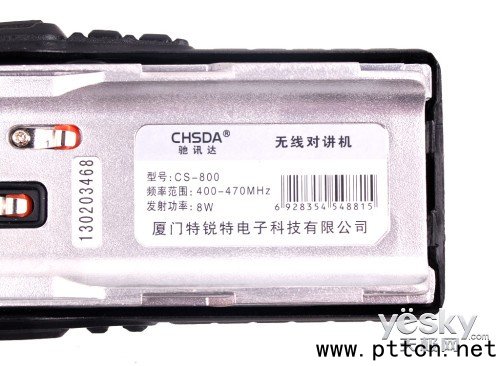 CS-800電池倉內(nèi)的銘牌標(biāo)簽 馳迅達(dá)CS-800的機(jī)身內(nèi)采用了鋁合金框架,可大幅度增加機(jī)器手感和機(jī)械強(qiáng)度,抗摔能力得到進(jìn)一步增強(qiáng)。拆下CS-800的電池后,我們可以看貼有產(chǎn)品參數(shù)說明的銘牌! 4馳迅達(dá)CS-800全頻段對講機(jī)外觀細(xì)節(jié)介紹(三)