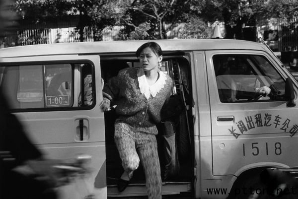 1995年,北京,女乘客從黃面的上下來。20世紀(jì)90年代,北京滿街都是這種低檔廉價(jià)的“黃面的”。