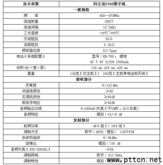 科立訊S760商用數(shù)字對(duì)講機(jī)產(chǎn)品特點(diǎn): 出色的環(huán)境噪聲抑制,數(shù)字話音更清晰; 數(shù)字/模擬兼容,確保模擬設(shè)備平滑過(guò)渡; 千萬(wàn)組數(shù)字密匙語(yǔ)音加密,安全有保障; 數(shù)字智能信令,更豐富的管理調(diào)度功能。 科立訊S760商用數(shù)字對(duì)講機(jī)功能描述: 1、FDMA頻分多址技術(shù),頻譜利用率成倍提高; 2、支持?jǐn)?shù)字模式、模擬模式; 3、數(shù)字語(yǔ)音加密; 4、多種呼叫模式,全呼、組呼、個(gè)呼、緊急呼叫; 5、PTT默認(rèn)聯(lián)系人(組)呼叫; 6、緊急報(bào)警(單機(jī)、聯(lián)動(dòng))3×4種模式; 7、遙斃、激活; 8、工作狀態(tài)查詢; 9、數(shù)字省電模式; 10、1.8英寸超大LCD顯示,支持圖標(biāo)顯示,方便短信息、通話記錄閱讀; 11、高低功率、信號(hào)強(qiáng)度、電池容量顯示,實(shí)時(shí)了解工作狀態(tài); 12、通話記錄,可顯示20條通話記錄; 13、通訊錄功能,支持50個(gè)聯(lián)系人; 14、可編輯短信功能、預(yù)設(shè)快捷短消息 15、手動(dòng)撥號(hào) 16、來(lái)電及短信振鈴提示 17、固件編程模式(軟件升級(jí)); 科立訊S760商用數(shù)字對(duì)講機(jī)常規(guī)功能: 1、中、英文操作界面; 2、發(fā)射高、低功率可選; 3、三色LED指示燈指示發(fā)送、接收、掃描等狀態(tài); 4、信道鎖定、鍵盤鎖定功能; 5、耳語(yǔ)功能; 6、亞音/數(shù)字亞音; 7、尾音消除; 8、監(jiān)聽(tīng)功能; 9、數(shù);旌蠏呙; 10、TOT限時(shí)發(fā)射保護(hù); 11、計(jì)算器。