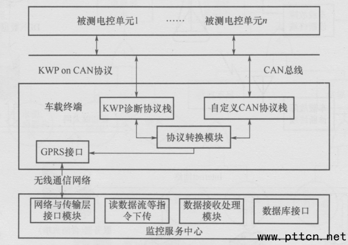 電動觀光車遠程實時監(jiān)控系統(tǒng)包含兩路通信:一路是監(jiān)控終端與整車通過CAN通道進行通信,采用高速500kbps速率,數(shù)據(jù)鏈路層協(xié)議符合Bosch2.OB標準,應用協(xié)議采用自定義CAN應用協(xié)議以及KWP2000協(xié)議來進行控制與數(shù)據(jù)通信;另一路是無線GPRS通信協(xié)議,理論速率為115kbps。在此前項目的應用協(xié)議基礎上,新增相關部分協(xié)議用于電動車輛,包含相關指令與數(shù)據(jù)格式,制定了完善的通信協(xié)議。協(xié)議處理流程圖如圖所示。