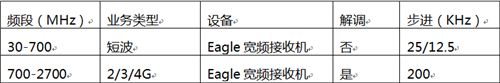 2-3測(cè)量系統(tǒng)結(jié)構(gòu)圖 系統(tǒng)由標(biāo)準(zhǔn)全向天線、Eagle寬頻接收機(jī)、遠(yuǎn)程控制數(shù)據(jù)回傳系統(tǒng)、頻譜地圖分析平臺(tái)組成,各部分的主要功能如下: ·標(biāo)準(zhǔn)全向天線:在移動(dòng)通信頻段范圍內(nèi)有準(zhǔn)確的天線因子或增益曲線; ·Eagle寬頻接收機(jī):提供2MHz-3GHz的測(cè)量功能。具備對(duì)GSM / CDMA / CDMA-EVDO / TD-SCDMA / WCDMA / TD-LTE / FDD-LTE空中信號(hào)的測(cè)量和解碼功能。 ·遠(yuǎn)程控制數(shù)據(jù)回傳系統(tǒng):Eagle寬頻接收機(jī)內(nèi)置數(shù)據(jù)回傳系統(tǒng),具備自動(dòng)回傳和遠(yuǎn)程控制功能,有效解決了數(shù)據(jù)的集中和管理問題,提高了人員使用的效率。 ·頻譜地圖分析平臺(tái):可完成頻譜使用情況評(píng)估、公網(wǎng)臺(tái)站合規(guī)使用情況評(píng)估、無線頻譜大數(shù)據(jù)動(dòng)態(tài)可視化。 2.1.2 Eagle寬頻接收機(jī)特色: Eagle寬頻接收機(jī)是本系統(tǒng)掛載的前臺(tái)接收測(cè)試設(shè)備,它自帶GPS,能夠遠(yuǎn)程控制并回傳數(shù)據(jù),主要用來收集測(cè)試頻段頻率和電平值,時(shí)間信息,經(jīng)緯度信息。應(yīng)用于本系統(tǒng),具有以下突出特點(diǎn): · 測(cè)試頻段寬:具有2M~3G超寬頻帶連續(xù)測(cè)量 ·頻譜測(cè)量速度快:高達(dá)3G/s(2000采樣點(diǎn)MAX),適用于各種不同場(chǎng)景測(cè)試應(yīng)用,如:高鐵、高速道路、一般道路和室內(nèi)測(cè)試等。 ·靈敏度高:-130dBm(@20M寬帶解調(diào));-165dBm/Hz(@頻譜測(cè)量); ·支持TDD-LTE\FDD-LTE\TDSCDMA\WCDMA\EVDO\CDMA\GSM全制式測(cè)量,實(shí)現(xiàn)移動(dòng)運(yùn)營(yíng)商基站定位功能。 ·具備數(shù)據(jù)回傳及遠(yuǎn)程控制功能,實(shí)現(xiàn)設(shè)備遠(yuǎn)程控制和自動(dòng)測(cè)量。 2.1.3 測(cè)試參數(shù)設(shè)置