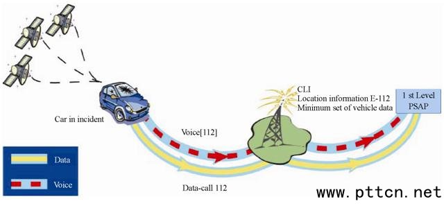 圖1 車載應急通信系統(來自www.heero-piot.et) 2 車載應急通信技術及標準現狀 2.1 技術發展背景 車載應急通信系統的技術近年在歐洲和俄羅斯發展迅速。早在2005年歐盟委員會(European Commission)提出建立車載緊急呼叫業務eCall的需求,希望在歐洲范圍內統一實施部署車載緊急呼叫服務系統。為了推廣這項重要的道路安全措施,2005年歐盟委員會將技術標準任務下達至ETSI/3GPP(ETSI 歐洲電信標準協會),對eCall技術通信標準體系進行開發建設;2008年,ETSI/3GPP開始發布eCall通信模塊技術系列標準;2011年,歐洲9國共同成立HeERO(泛歐州車車載緊急呼叫業務)聯盟,召集各國汽車行業和通信行業的公司組織共同加入對eCall的系統性推廣建設,致力于建立一個在歐洲范圍內可實現互操作的互聯互通的車載應急通信大系統。HeERO聯盟的任務包括對eCall業務系統的模式設計和部署規劃、技術標準的起草推動、技術試驗測試、試商用推廣等。截止到2015年,HeERO已經發展到16個國家范圍和包含車和通信行業在內的43個產業合作伙伴的加盟。 此外,俄羅斯近年大力發展車載應急通信系統,基于俄羅斯的GLONASS定位衛星系統,提出ERA_GLONASS車載應急通信系統,其技術方案與歐洲eCall系統技術方案類似,也即在發生嚴重交通事故后,通過該系統也能夠自動撥叫俄羅斯緊急救援電話,并且報告事故車輛所處的位置和車倆信息,其定位衛星技術明確使用的是俄羅斯的衛星定位GLONASS系統。目前,俄羅斯已經啟動了對ERA_GLONASS技術的強制要求。 2.2 技術原理簡介 車載應急通信技術(eCall技術)的設計主要包含兩條通信路徑:如圖2所示,一條路徑為通過蜂窩網絡撥打語音緊急呼叫,這個過程與蜂窩網絡緊急呼叫的實現原理一致;另一條路徑是通過衛星通信系統截取的定位信息,將位置信息及相關車輛信息打包成規范化格式的數據信息單元通過蜂窩移動網絡傳送給應急業務平臺。通過這兩個通信路徑,當汽車發生緊急情況(如碰撞),人為或自動的觸發應急狀態,將終端模塊當前的位置信息通過蜂窩網絡傳送給應急業務平臺,同時發起緊急呼叫,聯絡到應急業務平臺,在盡量短時間內完成事故上報。