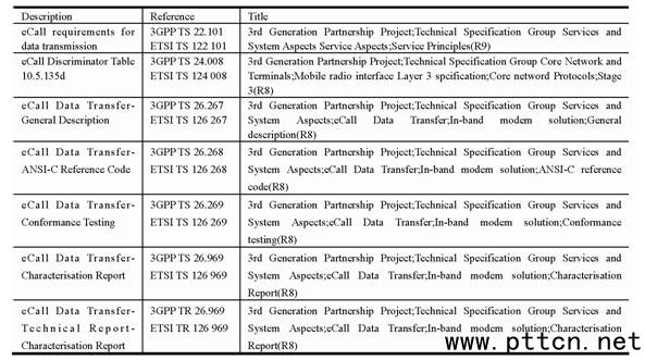 圖3 車載應急通信系統蜂窩系統框架(來自3GPP TS26.267) ETSI/3GPP制定的eCall技術標準詳細對IVS Data Modem和PSAP Data Modem兩個功能實體進行了最小數據單元(MSD-Minimum Set of Data)的結構設計、字段內容定義以及發送接收的流程的全面定義,系列標準參見表1。 表1 系列標準