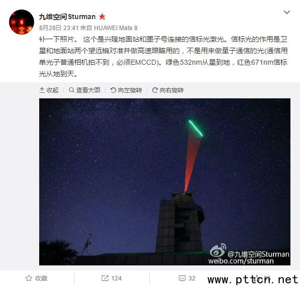 主頁(http://www.130131.com):中國量子衛(wèi)星對地通信照片公布:發(fā)射綠光 信標光的作用是衛(wèi)星和地面站兩個望遠鏡對準并做高速跟瞄用的,不是用來做量子通信的光(通信用單光子普通相機拍不到,必須EMCCD)。綠色532nm從星到地,紅色671nm信標光從地到天。 @九維空間Sturman進一步解釋稱,衛(wèi)星和地面站各有一個望遠鏡來收和發(fā)量子通信的單光子,所以需要旁邊用信標激光來瞄準。 @九維空間Sturman表示,量子衛(wèi)星與地面站的激光對接難度非常高,500km的軌道高度,第一宇宙速度,200mm口徑的望遠鏡,難度相當于你站在五十公里以外把一枚一角硬幣準確地扔進一列全速行駛的高鐵上的一個礦泉水瓶里! 這一點也可在量子科學實驗衛(wèi)星首席科學家潘建偉所曾經(jīng)的一番講話中得到證實。 潘建偉說,“墨子號”要想保證距離地球表面數(shù)百公里的光信號能夠順利被地面光學天線接收,難度就好比是“針尖對麥芒”一樣。由于衛(wèi)星發(fā)射的光信號是極其微弱的單光子級別,在由空間向地面?zhèn)鬏數(shù)倪^程中會受到許多因素的干擾,比如星光、燈光等都將成為干擾信號傳輸?shù)谋尘霸肼暋?/p> 此外,衛(wèi)星的運動速度很快,地面的光學天線必須時刻緊跟衛(wèi)星的“節(jié)奏”才有可能實現(xiàn)信號的準確接收。 所以,在“墨子號”量子通信衛(wèi)星的設計過程中,不僅要克服各種噪聲的干擾保證信號源的穩(wěn)定,同時還要實現(xiàn)與地面光學天線的準確對接。 盡管條件苛刻,但是在我國科學家的不懈努力下,如此不可思議的技術(shù)難題也依然得到了解決。