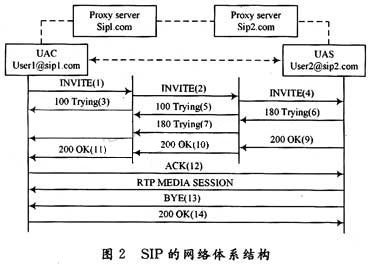 作為用戶代理服務(wù)器的3種類(lèi)型之一,重定向服務(wù)器通過(guò)發(fā)送被呼叫者獲得的SIP URL地址處理INVITE消息。代理服務(wù)器執(zhí)行應(yīng)用層的SIP請(qǐng)求和響應(yīng)路由。代理服務(wù)器可以是有記憶的,也可以是無(wú)記憶的。有記憶的代理服務(wù)器在處理完一個(gè)呼叫后,將完全忘記有關(guān)該呼叫的所有信息,直到下一個(gè)消息的到達(dá)。另外,代理可以是有分支代理,亦可以是無(wú)分支代理,例如,有分支代理可讓幾部電話同時(shí)振鈴,直到有人拿起其中1部電話為止,而無(wú)分支代理一次只能有一部電話振鈴。注冊(cè)服務(wù)器一般用于記錄SIP地址(SIP URL)和相關(guān)的IP地址,通常用于啟動(dòng)后的注冊(cè)。由于在REGISTER消息中使用SIP URL地址,當(dāng)INVITE請(qǐng)求到達(dá)時(shí),代理服務(wù)器或重定向服務(wù)器可直接轉(zhuǎn)發(fā)請(qǐng)求信息。這一基于注冊(cè)服務(wù)器的轉(zhuǎn)發(fā)特性構(gòu)成了網(wǎng)絡(luò)支持真正的號(hào)碼移動(dòng)性服務(wù)的基礎(chǔ)。通常情況下,一個(gè)SIP網(wǎng)絡(luò)服務(wù)器可實(shí)現(xiàn)不通種類(lèi)服務(wù)器的組合。SIP呼叫典型的流程,如圖2所示。 圖2中,User@sipl.com作為UAC,希望同User2@sip2.com通話,UAC首先發(fā)送一個(gè)INVITE請(qǐng)求,本地的SIP代理服務(wù)器sipl.com接收到這個(gè)INVITE請(qǐng)求后,經(jīng)過(guò)地址解析,將其發(fā)送至SIP代理服務(wù)器sip2.corn,同時(shí)sip1.com返回給User1一個(gè)100 Trying消息。sip2.com接收到sip1.com的INVITE請(qǐng)求后,將其轉(zhuǎn)發(fā)給user2@sip2.com,并返回給sip1.com一個(gè)Trying消息。User2接收到INVITE請(qǐng)求后,在應(yīng)答之前,將返回給sip2.com一個(gè)180 Ringing消息,此Ringing消息將依次轉(zhuǎn)發(fā)給sip1.com,User1。如果User2決定應(yīng)答呼叫,則返回一個(gè)200 OK消息,此消息經(jīng)過(guò)sip2.com,sip1.com,最后到達(dá)User1。User1在收到200 OK消息后,直接發(fā)送一個(gè)ACK確認(rèn)消息給User2。至此呼叫建立過(guò)程完成,User1和User2之間可以建立媒體通道進(jìn)行對(duì)話。當(dāng)一方想結(jié)束通話時(shí),發(fā)送一個(gè)BYE消息給對(duì)方,對(duì)方返回一個(gè)200 OK消息,SIP呼叫即被終止。