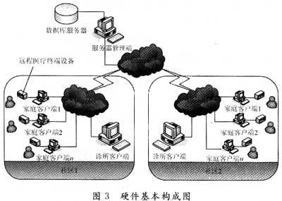 社區(qū)遠(yuǎn)程醫(yī)療系統(tǒng)采用SIP協(xié)議作為系統(tǒng)設(shè)計(jì)的關(guān)鍵協(xié)議,是基于其在結(jié)合Internet設(shè)計(jì)方面有著明顯的優(yōu)越性: (1)SIP擁有優(yōu)異的可擴(kuò)展性,可以大大降低對(duì)中心節(jié)點(diǎn)(核心網(wǎng)絡(luò)服務(wù)器)的壓力,使系統(tǒng)服務(wù)邊緣化。 (2)使用SIP協(xié)議可以簡(jiǎn)單易行的嵌入廉價(jià)的終端用戶設(shè)備,并且可確保其互操作能力,使不同的設(shè)備進(jìn)行通信。 (3)SIP強(qiáng)調(diào)支持多方會(huì)議,包括IP多播和請(qǐng)求分支的功能,這為遠(yuǎn)程會(huì)診提供了很好的支持。 2 系統(tǒng)總體設(shè)計(jì)思路及實(shí)現(xiàn) SIP協(xié)議在網(wǎng)絡(luò)視頻監(jiān)控、網(wǎng)絡(luò)會(huì)議、VoIP等領(lǐng)域有較為成功的應(yīng)用。借鑒SIP在這些方面應(yīng)用的成功經(jīng)驗(yàn),本文給出的基于SIP的社區(qū)遠(yuǎn)程網(wǎng)絡(luò)系統(tǒng)采用個(gè)人計(jì)算機(jī)為基礎(chǔ),以計(jì)算機(jī)通信網(wǎng)絡(luò)為技術(shù)平臺(tái),采用模塊化設(shè)計(jì),一期工程主要構(gòu)架以監(jiān)護(hù)心電、血壓等生理參數(shù)為目標(biāo),并可以進(jìn)行遠(yuǎn)程會(huì)診的監(jiān)護(hù)網(wǎng)絡(luò),實(shí)現(xiàn)病人在社區(qū)中就能及時(shí)得到醫(yī)生或領(lǐng)域?qū)<业谋O(jiān)護(hù)急救處理、康復(fù)指導(dǎo)、病史管理等多項(xiàng)醫(yī)療服務(wù)。系統(tǒng)采用模塊化設(shè)計(jì),可以針對(duì)不同的慢性病人和老年人的監(jiān)護(hù)要求提供不同的服務(wù)功能。 2.1 系統(tǒng)的硬件構(gòu)成及連接 該社區(qū)遠(yuǎn)程醫(yī)療系統(tǒng)由用戶終端設(shè)備(家居攝像頭、個(gè)人計(jì)算機(jī)、醫(yī)療終端)、社區(qū)醫(yī)生電子工作站、社區(qū)健康檔案數(shù)據(jù)庫(kù)等組成。利用醫(yī)院院區(qū)及社區(qū)范圍內(nèi)已有的計(jì)算機(jī)網(wǎng)絡(luò)系統(tǒng),將系統(tǒng)的軟件安裝即可使用。系統(tǒng)采用C/S結(jié)構(gòu),分為客戶端、業(yè)務(wù)邏輯中間層和服務(wù)器端。從內(nèi)容上分為用戶信息管理、個(gè)人健康檔案管理、醫(yī)生信息管理及會(huì)診管理。系統(tǒng)由數(shù)據(jù)庫(kù)服務(wù)器、社區(qū)診所服務(wù)器一客戶端、家庭客戶端和用戶界面文件系統(tǒng)構(gòu)成,安裝時(shí)系統(tǒng)將區(qū)分社區(qū)客戶端和家庭客戶端分別將所需文件自動(dòng)安裝并完成相應(yīng)的設(shè)置。每次通信均由隨機(jī)啟動(dòng)的客戶進(jìn)程發(fā)起,服務(wù)器進(jìn)程從開(kāi)機(jī)就處于等待狀態(tài),隨時(shí)對(duì)客戶進(jìn)程進(jìn)行響應(yīng),從而滿足監(jiān)控的要求。 社區(qū)醫(yī)療系統(tǒng)的硬件基本構(gòu)成如圖3所示。