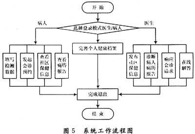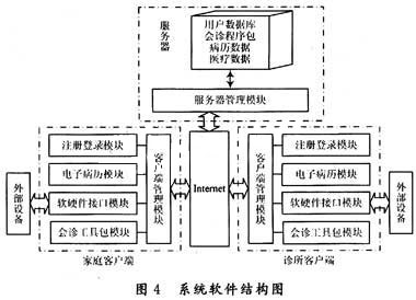在系統(tǒng)的硬件設(shè)計(jì)上,需要建立一個(gè)數(shù)據(jù)庫(kù)服務(wù)器,采用一個(gè)大硬盤(pán)的中高檔微機(jī)即可,主要是硬盤(pán)存儲(chǔ)量要大,以便于建立病人數(shù)據(jù)庫(kù)以及存儲(chǔ)醫(yī)療數(shù)據(jù)等。服務(wù)器安裝Windows NT Server操作系統(tǒng),由于他提供了客戶機(jī)/服務(wù)器模式,使得網(wǎng)絡(luò)處理速度可以加快。在用戶和社區(qū)診所中僅需要1臺(tái)微機(jī)和一些簡(jiǎn)易的監(jiān)控、采集器械便可使病人實(shí)現(xiàn)在家中就醫(yī)的方便模式。另外,對(duì)一些患有較嚴(yán)重慢性病患者和老年人可以在其家中裝備監(jiān)控儀器,如:用于糖尿病人的血糖儀;用于哮喘病人的峰值呼吸流量計(jì);用于心臟病人的心電圖機(jī);用于高血壓病人的電子血壓計(jì)等。同時(shí),社區(qū)診所還可以提供一些面向胎兒和孕婦的監(jiān)護(hù)設(shè)備,對(duì)本社區(qū)內(nèi)的懷孕家庭租借,并對(duì)他們進(jìn)行監(jiān)護(hù),這對(duì)孕婦特別是高危妊娠孕婦和胎兒都具有很好的幫助和指導(dǎo)作用。數(shù)據(jù)庫(kù)服務(wù)器可以放置在社區(qū)診所中與社區(qū)診所服務(wù)器一客戶端共用同一臺(tái)微機(jī),通過(guò)對(duì)Windows NT服務(wù)器進(jìn)行設(shè)置,可將本社區(qū)內(nèi)的微機(jī)聯(lián)成小型的局域網(wǎng)絡(luò),方便于管理。 2.2 軟件功能模塊構(gòu)成及實(shí)施 系統(tǒng)軟件結(jié)構(gòu)如圖4所示。 系統(tǒng)的核心軟件為一個(gè)遠(yuǎn)程動(dòng)態(tài)管理平臺(tái)。注冊(cè)登錄模塊實(shí)現(xiàn)社區(qū)用戶和社區(qū)醫(yī)生的注冊(cè)登錄,記錄病人的基本情況,并對(duì)用戶的資料進(jìn)行管理。電子病歷模塊記錄病人的歷次診斷記錄、檢查結(jié)果和治療措施等。軟硬件接口模塊提供系統(tǒng)與遠(yuǎn)程醫(yī)療終端的數(shù)據(jù)傳輸,并可根據(jù)需要設(shè)置相應(yīng)參數(shù)。遠(yuǎn)程會(huì)診工具包模塊提供患者向醫(yī)生面對(duì)面的咨詢,同時(shí)醫(yī)生也可通過(guò)他對(duì)病人的康復(fù)狀況有一個(gè)視覺(jué)上的了解。