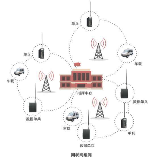 不同的組網(wǎng)方式也使得TDD-OFDM技術(shù)在傳輸距離上有更多的優(yōu)勢—— 1. 網(wǎng)狀組網(wǎng)方式 組成網(wǎng)狀網(wǎng)形式數(shù)字無線圖像傳輸,多個基站組成系統(tǒng),前端采集由車頂云臺、手持?jǐn)z像機(jī),將圖像、音頻編碼后通過數(shù)字方式通過基站傳輸至指揮中心。 各遠(yuǎn)端設(shè)備在基站之可以動漫游,無需人工干預(yù)。指揮中心可以通過指令控制遠(yuǎn)端的云臺,與遠(yuǎn)端通話或傳輸數(shù)據(jù)等。系統(tǒng)如圖所示。