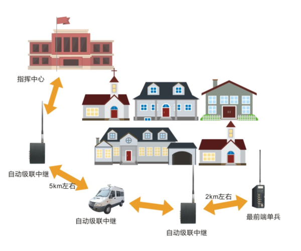 2. 中繼傳輸方式 單兵/通訊車/無人機(jī)等前端傳輸系統(tǒng)通過臨時中繼到通信指揮車/機(jī)載平臺/手提箱傳輸至指揮部:由于距離超過單兵覆蓋范圍時,單兵傳輸系統(tǒng)無法將現(xiàn)場的音視頻實(shí)時傳輸?shù)酵ㄐ胖笓]車/機(jī)載平臺,這時候需要增加臨時中繼臺。本模式比較適用于環(huán)境比較苛刻遠(yuǎn)距離傳輸,如地下室巡檢,樓宇巡檢,隧道救援、異地刑偵等。