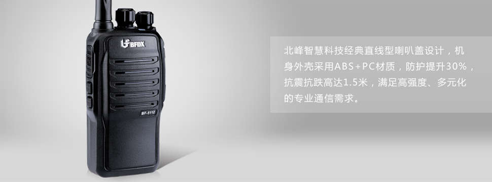 主頁(http://www.130131.com):北峰BF-5112 商務(wù)對講 專家品質(zhì) 北峰BF-5112隸屬福建北峰通信科技股份有限公司旗下產(chǎn)品,該產(chǎn)品外觀沉穩(wěn)大氣,按鍵經(jīng)久耐用,品質(zhì)精良,是一款經(jīng)典的商務(wù)對講機,能夠滿足各行業(yè)緊急調(diào)度,一呼百應(yīng),掌握全局。 北峰BF-5112專業(yè)調(diào)頻商用對講機,外殼采用PC+ABS材質(zhì),整機防護提升30%,1.5米抗震抗跌;特有電池保護板,電池壽命提升30%;30萬次按鍵測試,PTT發(fā)射壽命提升30%,30%的性能提升,關(guān)鍵時刻帶來300%的通信效率,專家品質(zhì)滿足您一呼百應(yīng)掌握全局的專業(yè)通信需求,是一款非常專業(yè)的建筑對講機、工廠對講機、保安對講機! 監(jiān)聽功能 可監(jiān)聽到當前信道的微弱聲音,該功能有助于收聽到微弱信號。 信道掃描 按下掃描鍵,對添加掃描信道進行逐個掃描,可接收到當前有活動信道的通話。 聲控功能VOX 開啟聲控功能時,無需按PTT鍵便可進行通話(需配帶耳機)。 電腦寫頻 通過電腦寫頻軟件對功能參數(shù)進行設(shè)置。 靜噪等級設(shè)置(0~9級) 9級靜噪,根據(jù)不同環(huán)境選擇您所需要的靜噪等級。 發(fā)射超時限時器TOT 防止對講機過久占用某個信道,避免不慎占用信道的現(xiàn)象。 寬/窄帶轉(zhuǎn)換 每個信道間隔為25KHz或12.5KHz。 低電提醒 電池電量不足時提醒您更換電池。 繁忙信道禁發(fā)BCL 防止向繁忙信道發(fā)送信號,避免當前通話受到干擾。 省電功能 當省電模式為“開”,對講機未接收到信號或無操作時,將自動進入省電模式,從而降低耗電量,延長電池的使用時間。 CTCSS/ CDCSS及尾音消除 該對講機具有39組標準亞音頻和83組標準亞音數(shù)碼,支持非標準 CTCSS/CDCSS,設(shè)置CTCSS或CDCSS后,可以消除同頻所帶來的干擾,還可以消除發(fā)送方由于通話結(jié)束、載波引起的“咔嚓”聲。