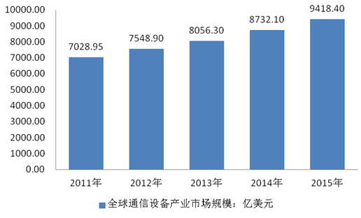資料來源:國際電信聯(lián)盟 2014年達到8732.10億美元,2015年全球通信設(shè)備產(chǎn)業(yè)規(guī)模超過9400億美元,保持穩(wěn)定增長,其中移動通信設(shè)備市場規(guī)模繼續(xù)放大。 2007-2015年全球通信設(shè)備產(chǎn)業(yè)規(guī)模(億美元)