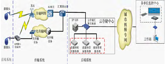 圖1:系統總體架構圖 本項目建設新建高清視頻圖像采集系統、配套云存儲中心,并接入城市視頻專網。建設部分主要由前端系統、傳輸系統、后端存儲系統等組成。 總體組網結構如下圖所示,見圖2。