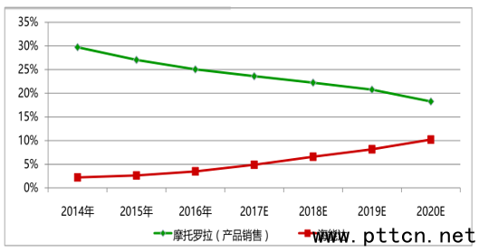 數(shù)據(jù)來源:公開資料整理 2012-2016年,Moto專網(wǎng)產(chǎn)品銷售收入每年都下滑,市場份額在逐步往下掉。而海能達收入從2012年的11.3億到2016年的34.3億,市場份額在持續(xù)提升。比如國內(nèi)公安專網(wǎng)PDT、荷蘭公共安全項目、世界杯項目等,海能達都勝出了。預(yù)計,2020年海能達全球市場份額有望上升至10%,而Moto的份額有可能下滑到20%以下。 全球無線專網(wǎng)通信市場規(guī)模及增速