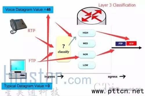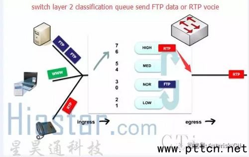 以上是通過標簽802.1Q/P打標簽的管理方式來優(yōu)化傳輸。這樣,可以實現(xiàn)交換機對終端數(shù)據(jù)的優(yōu)先處理。 另外,網(wǎng)絡(luò)管理員也可以通過switch的layer 2 classification 通過隊列的方式來優(yōu)先處理RTP語音。這里的RTP優(yōu)先級設(shè)置是最高的(High),F(xiàn)TP則為正常水平。