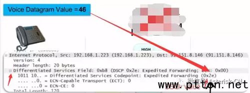 如果對終端話機抓包以后,可以看到消息中的DSCP值46(16進制0x2e):