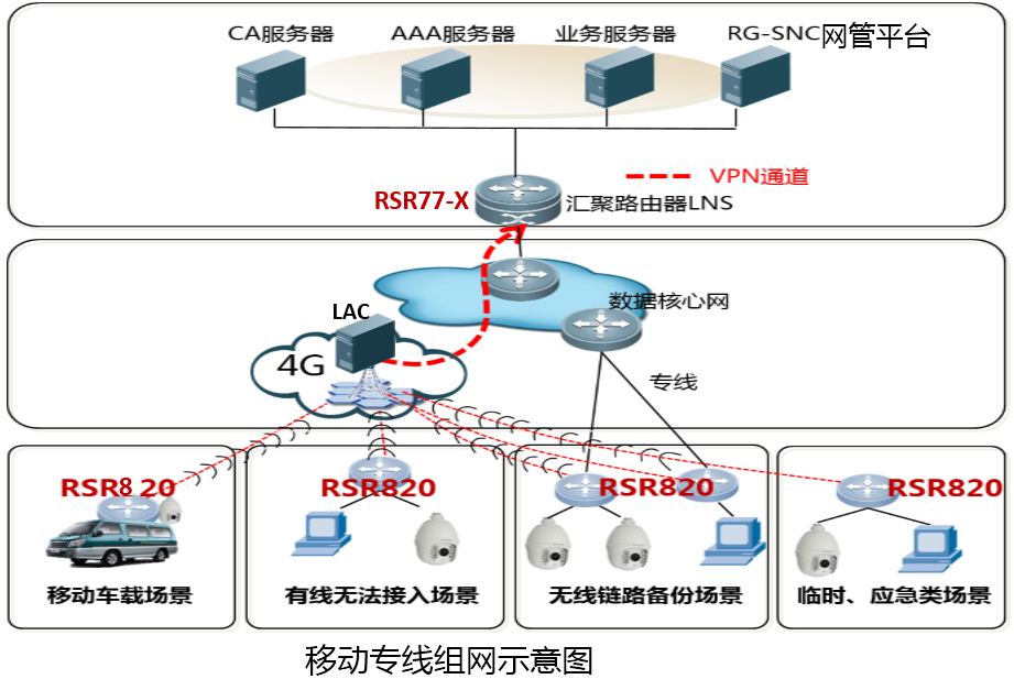 針對視頻會議業(yè)務(wù)重點保障,銳捷獨有的VDA(動態(tài)視頻自適應)技術(shù),可以精確識別需要保障的視頻會議業(yè)務(wù),通過關(guān)鍵路徑資源預留,網(wǎng)絡(luò)設(shè)備動態(tài)自適應建立通道,結(jié)合IDA專利技術(shù)實時動態(tài)精準調(diào)控流量,實現(xiàn)對視頻會議的業(yè)務(wù)體驗保障。 移動專線多場景接入 針對站點和人員全覆蓋問題,首先,銳捷路由器支持的VPE功能可以實現(xiàn)MPLS VPN邏輯隔離和IP Sec VPN安全接入的結(jié)合,在網(wǎng)絡(luò)側(cè)實現(xiàn)沒有專線區(qū)域的接入補盲、出差及移動辦公人員的安全接入等接入控制需求。 在用戶側(cè),針對重點監(jiān)控場所、有限難達場所、臨時場所等多種場景,量身定制的移動路由器可以實現(xiàn)光纖、4G熱備/冷備,4G單鏈路專線等接入。 通過在用戶接入側(cè)部署RSR 820,在網(wǎng)絡(luò)側(cè)匯聚層部署RSR77-X,可以滿足移動車載、有線難達接入、無線鏈路備份、臨時應急使用等多場景靈活接入需求。 移動路由器雙鏈路接入組網(wǎng),可以提供毫秒級故障收斂的可靠性保障的前提下,對比租用光纖建網(wǎng),極大節(jié)省建網(wǎng)費用,縮短建設(shè)周期。 銳捷移動路由器工業(yè)級可靠性設(shè)計,可以在各種惡劣環(huán)境、氣候條件下保證業(yè)務(wù)穩(wěn)定運行,我們的移動路由器在西藏日喀則,黑龍江漠河等嚴酷環(huán)境下都經(jīng)受住了考驗。 同時,移動路由器的寬壓、防震等設(shè)計,能夠在車載環(huán)境下便捷掛裝使用,為移動場景提供可靠的業(yè)務(wù)接入。