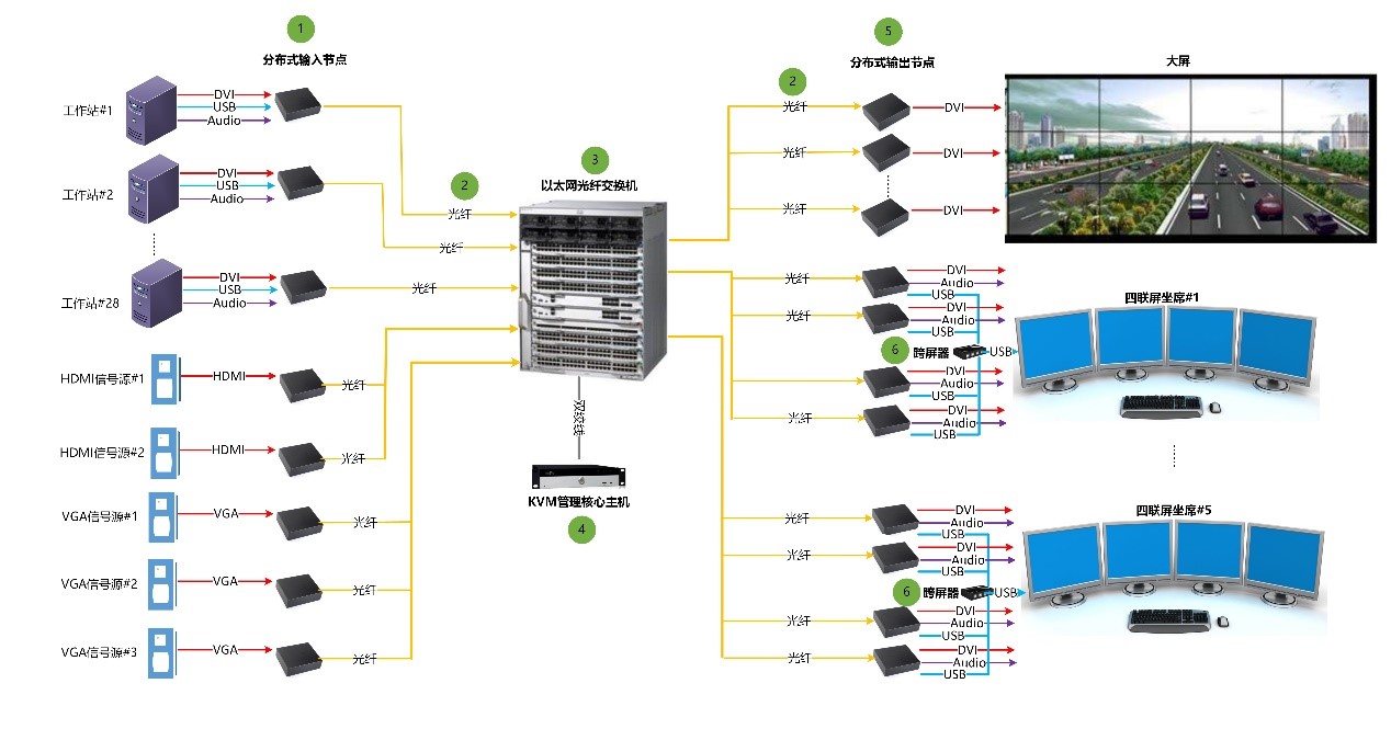 圖1:傳統(tǒng)分布式KVM坐席協(xié)作系統(tǒng)架構(gòu)圖 圖1是一張傳統(tǒng)分布式KVM系統(tǒng)架構(gòu)圖,從圖中可以看到,系統(tǒng)架構(gòu)的組成部分是:以太網(wǎng)光纖交換機(jī)、KVM管理核心主機(jī)、分布式輸入節(jié)點(diǎn)、分布式輸出節(jié)點(diǎn)、跨屏器。這些設(shè)備構(gòu)成了一套KVM系統(tǒng),部分廠(chǎng)商將其稱(chēng)為“分布式KVM坐席協(xié)作系統(tǒng)”,強(qiáng)調(diào)其“去中心化”的產(chǎn)品特點(diǎn)。但是,對(duì)于關(guān)鍵任務(wù)環(huán)境下的控制室指揮中心來(lái)說(shuō),交換機(jī)架構(gòu)的分布式KVM系統(tǒng)無(wú)疑是存在諸多問(wèn)題的。 首先從技術(shù)上分析: 1. 從架構(gòu)來(lái)看,交換機(jī)+管理模塊的架構(gòu),依然沿用十五年前的陳舊技術(shù)模式。 2. 不少用戶(hù)將交換機(jī)等同于KVM管理核心主機(jī),而將交換機(jī)放在非常重要的位置。但事實(shí)上,對(duì)于專(zhuān)業(yè)機(jī)房來(lái)說(shuō),交換機(jī)制是最基本的設(shè)備,如圖1③所示,多交換機(jī)的配置起到的是路由連接的作用,實(shí)現(xiàn)網(wǎng)線(xiàn)100米、光纖10公里以上的連接,但并不具備KVM管理控制與主機(jī)備份功能。 3. 如圖1④所示,管理模塊作為系統(tǒng)的核心,主要實(shí)現(xiàn)用戶(hù)權(quán)限管理,音視頻調(diào)度,控制信號(hào)調(diào)度的功能,這為關(guān)鍵任務(wù)環(huán)境下的控制室指揮中心埋下了巨大的安全隱患。由于缺乏控制室指揮中心系統(tǒng)平臺(tái)必需的主機(jī)主備自動(dòng)熱跳轉(zhuǎn)備份機(jī)制,一旦KVM管理核心主機(jī)出現(xiàn)故障,整個(gè)坐席大廳也將面臨災(zāi)難性癱瘓,整個(gè)人機(jī)分離系統(tǒng)無(wú)法辦公,決策人員的指令無(wú)法落地,造成不可挽回的嚴(yán)重后果。【注:主機(jī)主備自動(dòng)熱跳轉(zhuǎn)備份機(jī)制,是指在控制室中,當(dāng)主用主機(jī)出現(xiàn)斷電、故障時(shí),平臺(tái)自動(dòng)無(wú)縫跳轉(zhuǎn)至備用主機(jī)繼續(xù)工作;主用主機(jī)一路發(fā)生中斷時(shí),平臺(tái)也能無(wú)縫自動(dòng)跳轉(zhuǎn)至備用主機(jī)的對(duì)應(yīng)線(xiàn)路繼續(xù)工作;整個(gè)過(guò)程自動(dòng)完成,無(wú)需人員干預(yù)和重新設(shè)置,整個(gè)平臺(tái)工作完全不中斷! 4. 如圖1②所示,分布式KVM系統(tǒng)采用光纖線(xiàn)材傳輸,部分廠(chǎng)商以光纖線(xiàn)材介質(zhì)將概念混淆為光纖KVM,包裝之后低成本高價(jià)出售。而在全球KVM坐席市場(chǎng)中,用戶(hù)認(rèn)可的光纖KVM所指的是:以?xún)?nèi)嵌光纖KVM芯片的光纖KVM主機(jī)構(gòu)建的閉環(huán)式光纖KVM坐席協(xié)作管理系統(tǒng)。 5. 大部分的分布式KVM坐席協(xié)作系統(tǒng)僅支持少數(shù)信號(hào)端口接入,對(duì)4K DP、DMS59、SDI等多種接口,需要通過(guò)轉(zhuǎn)接器進(jìn)行轉(zhuǎn)接,不利于信號(hào)傳輸?shù)姆(wěn)定性、切換操作的實(shí)時(shí)性。信號(hào)接入能力無(wú)法滿(mǎn)足多種信號(hào)源的專(zhuān)業(yè)控制室環(huán)境的需要。 6. 分布式KVM需要接入端(圖1①)、交換機(jī)(圖1③)、分布式管理模塊(圖1④)、跨屏處理器(圖1⑥)等必不可少的部分,架構(gòu)較為繁瑣復(fù)雜,也增加了大量故障節(jié)點(diǎn)。同時(shí),基于IP交換機(jī)網(wǎng)絡(luò)的傳輸,給黑客等不法分子有了可乘之機(jī),安全性一直備受考驗(yàn)。 從使用體驗(yàn)上看,分布式KVM采用的是交換機(jī)架構(gòu),實(shí)際上是一種有損壓縮的傳輸方式,由于受限于交換機(jī)帶寬,當(dāng)控制中心機(jī)房大量數(shù)據(jù)接入并發(fā)處理時(shí),持續(xù)高清碼流增加網(wǎng)絡(luò)帶寬壓力,容易造成丟包,使得信號(hào)出現(xiàn)卡頓、畫(huà)面顯示閃爍,甚至黑屏、光標(biāo)跑漂等問(wèn)題,無(wú)法實(shí)現(xiàn)使用價(jià)值,且隨著數(shù)據(jù)的不斷升級(jí),后期將越來(lái)越無(wú)法滿(mǎn)足信號(hào)接入的需求。 外接的跨屏處理器即為普通財(cái)務(wù)人員常用的跨屏處理設(shè)備,僅需數(shù)百元即可購(gòu)買(mǎi),僅能實(shí)現(xiàn)顯示器圖像的切換的簡(jiǎn)單功能。固化式的跨屏器,實(shí)現(xiàn)不了推送熱鍵的設(shè)置,更不支持坐席本地鍵盤(pán)一鍵推送上屏、抓取到屏的Ukey授權(quán)和信息分組推送等基本KVM坐席協(xié)作管理功能。 部分廠(chǎng)商的分布式KVM采用Web界面操作,使用左信號(hào)源選擇右終端點(diǎn)擊的選擇信號(hào)方式,不具備直達(dá)末端代碼的一鍵式指揮與隊(duì)列資源一鍵調(diào)控的功能,這與十五年前的模式完成一致,早已被現(xiàn)代化的指揮調(diào)度中心的作戰(zhàn)主管所摒棄。 總而言之,鍵盤(pán)鼠標(biāo)并不一定就是KVM,實(shí)現(xiàn)了KVM功能之后,距離真正的坐席協(xié)作管理還有很大的距離。 閉環(huán)式的光纖KVM坐席協(xié)作管理是全球坐席的趨勢(shì)在現(xiàn)代控制室的任務(wù)環(huán)境中,不同坐席人員的工作往往不是孤立的,而是需要同時(shí)處理大量的并發(fā)數(shù)據(jù)與信息,需要進(jìn)行各種不同信號(hào)的切換,同時(shí)與不同坐席、不同業(yè)務(wù)部門(mén)甚至是不同城市的人員進(jìn)行協(xié)同工作、互聯(lián)互通;在突發(fā)事件時(shí),可能還要進(jìn)行跨平臺(tái)