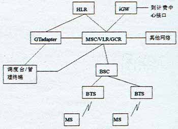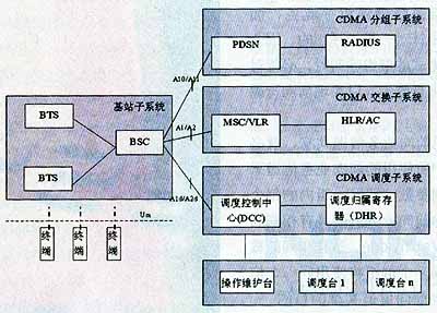 圖1 GoTa系統網絡參考模型 系統中包括如下邏輯功能模塊和子系統。 *集群終端 集群終端為用戶提供CDMA集群系統的各種集群業務,同時也為用戶提供傳統的普通電話業務、補充業務、短消息業務和數據業務。終端通過空中接口和集群系統相連,提供集群調度功能。 *基站子系統BSS SC組成。主要完成集群業務、數據業務和普通電話業務的接入功能。基站子系統BSS通過標準接口和調度子系統、CDMA核心網(包括交換子系統以及分組子系統)相連,滿足集群終端的各種業務需求,包括集群業務、電信業務和數據業務。 *調度子系統DSS DSS由調度控制中心DCC和調度歸屬寄存器DHR組成。DSS主要完成集群調度業務。DCC是集群呼叫的總控制點,完成集群調度呼叫的處理,包括鑒別集群用戶、建立各種集群呼叫如私密呼叫和群組呼叫、判斷集群PTT請求等。DCC作為調度控制中心,還接收反向鏈路來的集群語音數據,根據呼叫的性質再分發到對應的前向鏈路。 DHR完成數據庫管理和配置功能,為集群用戶提供群組注冊、群組成員注冊,還提供集群成員的本地信息以及集群成員的業務權限記錄,完成呼叫統計和計費功能。 *調度臺 調度臺是用戶組中具有特殊權限的終端,可以分為移動調度臺和固定調度臺。 固定調度臺同時與調度子系統和操作維護中心相連,可以發起和參與組呼、廣播等調度業務,也能夠實現對群組成員的管理功能。 移動調度臺可以發起組呼、廣播呼叫等調度業務,在組呼的話語權控制上有較高的優先級,具備簡單的群組用戶管理功能。 *CDMA核心網 CDMA核心網包括交換子系統和分組子系統。交換子系統主要完成電話互聯業務、普通電話呼叫業務和部分增值業務功能,并提供相關業務功能用戶信息的存儲和管理功能。分組子系統的主要功能是為用戶提供數據業務通道,從而向用戶提供高速的分組數據業務服務。 。2)關鍵技術 與GSM和CDMA公共蜂窩移動通信系統相比,在數字集群系統中有兩個特有的關鍵技術:業務信道的共享、呼叫的快速建立。 *前向無線業務信道的共享 由于集群系統提供組呼業務,而CDMA系統是針對一對一呼叫的,因此在實現PTT方式的群組呼叫時,必須對CDMA系統進行改造,以實現前向資源的共享。 為了實現前向業務信道共享,就必須對群組用戶所使用的前向業務信道采用相同的調制參數,即同一組內的每個用戶所分配的前向業務信道具有相同的長碼掩碼和WalshCode,這樣相同的載波/扇區下同一個群組將使用同一個信道,從而達到前向信道共享的目的。 為了達到群組用戶在前向信道共享的目的,在信令流程上必須增加相應參數(長碼掩碼和WalshCode)的傳遞。前向共享業務信道由F-FCH/F-SCH提供支持,并對前向信道的結構沒有進行改動,與原CDMA1x前向碼道不同的是:建立碼道時原設置的私有長碼掩碼改為調度組要求或指定的特殊公共長碼掩碼;不同的群組使用不同的長掩碼和WalshCode。與CDMA1x前向業務信道比較,Walsh碼資源與語音用戶相同,信道結構基本不變;長碼掩碼通過加密算法計算得到。 *呼叫的快速建立 集群系統中PTT呼叫的另一個重要特色就是快速連接。如果CDMA系統未經改造,則呼叫建立的時間將不能滿足PTT呼叫應用時的需要。 為了解決快速連接必須從兩個方面著手,一是將信令流程進行改造,減少不必要的流程和協商,盡量采用并行處理方式,節省用戶的接入時間,滿足PTT呼叫方式。另一方面,可通過使用增強型的接入信道,增加基站接入信道數量以及通過允許集群移動臺增大初始發射功率、功率增加步長,以及提高系統的接收靈敏度、優化搜索策略等技術,將接入試探控制在極短的時間內完成。另外,為了提高移動臺的接入成功率和通話的穩定性,系統可以考慮采用AccessProbeHandoff、AccessHandoff、Channel-assignament into soft/softer Handoff 等技術。 2.GT800系統 GT800是以GSM-R為基礎進行自主技術創新,兼容GSM和TD-SCDMA的無線接入技術,滿足行業用戶指揮調度需求的數字集群系統。 GT800根據基礎技術發展的成熟期分兩個階段實現: 。璓haseI:定位集群共網運營,采用GSM無線接入技術,支持現有主流集群系統業務功能,性能指標達到或優于現有集群體制(接續速度等); 。璓haseII:定位專網和共網集群,基于PhaseI核心網增強,同時支持GSM和TD-SCDMA接入技術,通過終端雙模向TD-SCDMA演進。 。1)GT800系統的網絡結構 GT800系統的網絡結構如圖2所示。