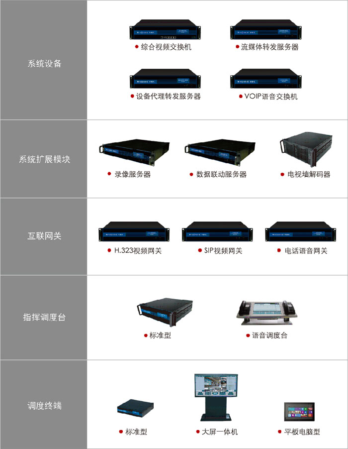 系統(tǒng)平臺 綜合視頻交換機 實現(xiàn)用戶身份認證、用戶及設備的權(quán)限和級別管理、終端地址解析、業(yè)務功能控制、設備管理、分級管理、支持單播和組播切換等功能。 可支持升級配置級聯(lián)模塊、雙流會議模塊、數(shù)據(jù)會議模塊、電子地圖模塊等,增強綜合視頻交換機的相應能力。 流媒體轉(zhuǎn)發(fā)服務器 實現(xiàn)視頻流、音頻流、數(shù)據(jù)流的多路復用轉(zhuǎn)發(fā),提供高清視頻流轉(zhuǎn)發(fā)機制,提高帶寬利用率,支持TCP/UDP互轉(zhuǎn)傳輸模式,支持分布部署。 設備代理接入服務器 實現(xiàn)多品牌監(jiān)控設備代理接入,實時巡檢、顯示各種終端設備狀態(tài)等。支持分布部署,提供高/標清視頻的接入,支持高清標清的混搭,滿足用戶的接入需求。 系統(tǒng)綜合維護管理軟件 系統(tǒng)綜合維護管理軟件支持綜合視頻交換機管理、電視墻控制、錄像控制管理、報警管理、雙機熱備監(jiān)視、編碼器配置的統(tǒng)一管理,并整合部分系統(tǒng)工具,使用戶管理和使用系統(tǒng)更加方便快捷。 系統(tǒng)擴展模塊 錄像服務器軟件:實現(xiàn)監(jiān)控集中錄像、指揮調(diào)度錄像、雙流錄像、專業(yè)數(shù)據(jù)影像采集錄像等,多種錄像形式,支持對錄像文件進行備份、恢復、刪除、編輯等操作。錄像服務器支持不間斷錄像、定時錄像、定點重復錄像、報警觸發(fā)錄像等多種錄像方式,支持分布部署,實現(xiàn)并發(fā)錄像負載動態(tài)均衡,滿足高清標清多種視頻圖像不同碼流的存儲優(yōu)化。 數(shù)據(jù)報警服務器:主要是連接防盜報警主機,通過數(shù)據(jù)報警服務器實現(xiàn)各級防盜報警系統(tǒng)與網(wǎng)絡視頻監(jiān)控系統(tǒng)聯(lián)動報警的功能。 電視墻解碼器 接收網(wǎng)絡視頻數(shù)據(jù)流,完成多路視頻解碼,實現(xiàn)多路模擬視頻信號集中輸出。兼容多種視頻編碼器,支持堆疊,滿足大容量模擬視頻集中顯示。 具體根據(jù)大屏幕電視墻的集中顯示效果定制,可分為電視墻多路解碼器和電視墻分屏解碼器。 互聯(lián)網(wǎng)關 H.323視頻網(wǎng)關 通過 H.323視頻網(wǎng)關與H.323視頻會議系統(tǒng)實現(xiàn)音視頻互連互通。 SIP視頻網(wǎng)關 通過SIP視頻網(wǎng)關可把IP語音電話、IP可視電話呼入到視頻指揮調(diào)度系統(tǒng)進行語音、視頻的雙向交互?梢曤娫捯部赏ㄟ^網(wǎng)關瀏覽視頻系統(tǒng)內(nèi)的視頻圖像。 語音電話網(wǎng)關 通過語音電話網(wǎng)關可與PSTN網(wǎng)進行互聯(lián),接模擬電話、手機等通用通信設備與指揮調(diào)度系統(tǒng)有效結(jié)合。 標準調(diào)度臺 H.323互聯(lián)網(wǎng)關 具有召開指揮、通信調(diào)度、雙向音視頻、四路視頻信號同時采集壓縮編解碼能力,支持觸摸屏顯示器,支持最多五路輸出模式,在調(diào)度臺上可完成視頻指揮、視頻監(jiān)控、數(shù)據(jù)呈現(xiàn)、數(shù)據(jù)會議、電話呼叫、可視電話呼叫、H.323會議終端呼叫等操作,從而實現(xiàn)視頻調(diào)度、視頻監(jiān)控、語音調(diào)度、數(shù)據(jù)呈現(xiàn)的各種功能。配合觸摸屏顯示器,達到顯示操作一體化,使操作控制更加方便,一目了然。 移動調(diào)度臺 移動調(diào)度臺具備標準指揮調(diào)度臺的全部功能的基礎上,其設備采用加固便攜式硬件配置,能夠適應車載應用、單兵便攜應用、野戰(zhàn)前站應用等,內(nèi)置低帶寬傳輸?shù)木W(wǎng)絡適應機制。 調(diào)度終端 調(diào)度終端做為系統(tǒng)的末梢終端,功能權(quán)限低于指揮調(diào)度臺,具備監(jiān)控視頻、參與指揮等功能。調(diào)度終端可以與語音電話、可視電話、323會議終端進行點對點雙向交互,支持回聲抵消,網(wǎng)絡動態(tài)調(diào)節(jié)等。 包括調(diào)度終端、調(diào)度終端(大屏幕型)、調(diào)度終端(一體機型)等終端類型。 監(jiān)控終端 監(jiān)控終端具有視頻解碼和語音雙向編解碼能力,通過監(jiān)控終端,用戶可完成遠程監(jiān)控操作。支持畫面多分屏瀏覽顯示、多種畫面輪巡顯示、本地錄象、預制位和巡航調(diào)用、對監(jiān)控前端語音雙向?qū)χv、電子地圖單雙屏顯示、系統(tǒng)報警管理等多種監(jiān)控功能應用。 包括C/S版監(jiān)控終端、WEB版監(jiān)控終端等終端類型。