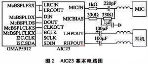 2.1 中央處理器與語音采集/播放模塊之間通信 這里選用TI公司的低功耗處理芯片OMAP5912,它采用ARM9+DSP55X的雙核構架。而聲卡主芯片選用TI公司的AIC23芯片,該芯片是一款高性能的立體聲語音編解碼器,提供模/數轉換和數/模轉換,數據格式支持16/20/24/32,采樣頻率支持[8 kHz,96 kHz]范圍內可調。如圖2所示,AIC23的可編程設置通過OMAP5912的I2C接口完成。AIC23的音頻數據通過與OMAP5912的MCBSP接口相連完成數字化音頻輸入/輸出,而AIC的耳麥輸入/輸出接口相對簡單,利用該電路可以完成自身語音的采集和還原其他用戶傳來語音信息。